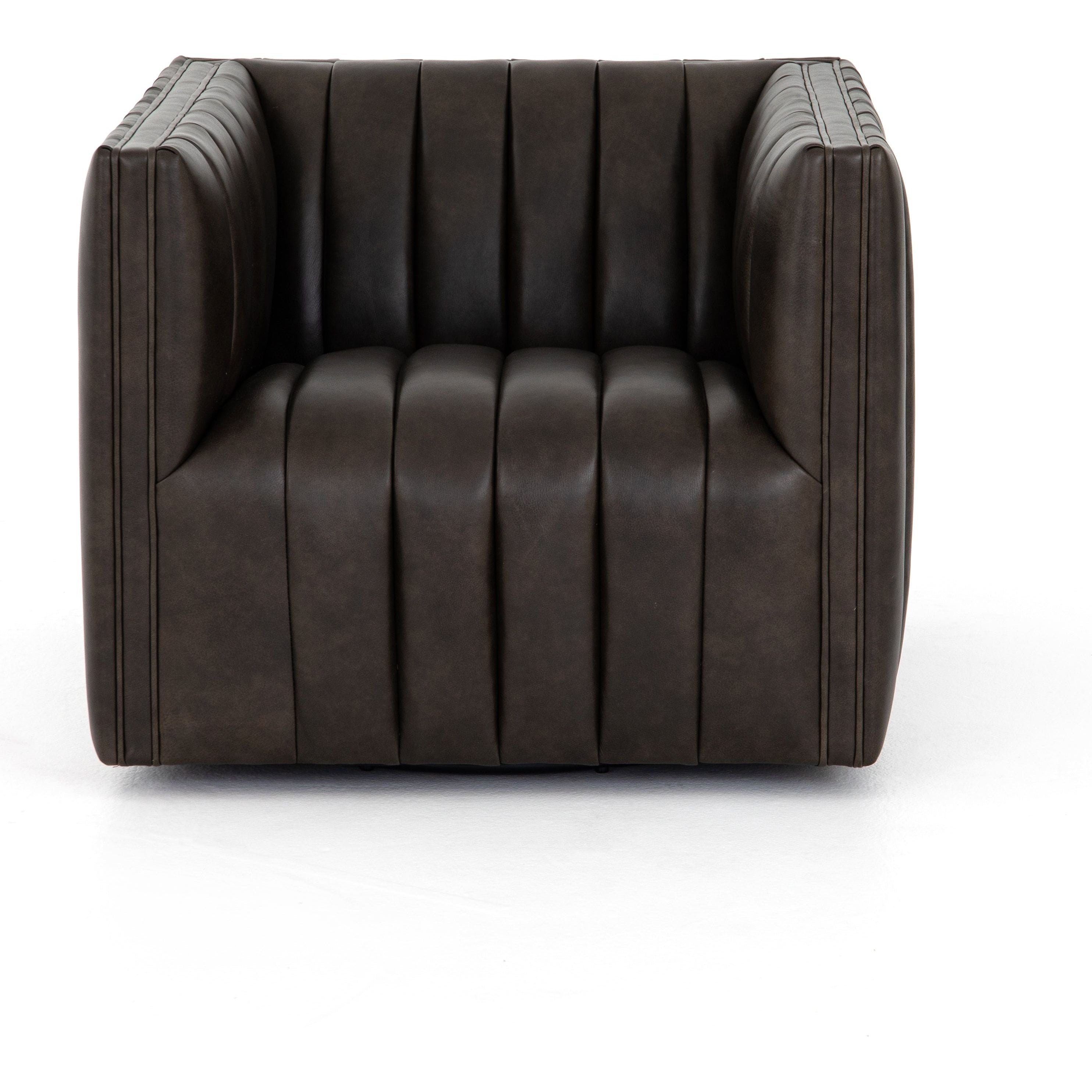 Featuring Henry Swivel Chair - Deacon Wolf by Four Hands at Amethyst Home. Upholstered in dreamy "wolf" leather -- this swivel chair is the perfect blend of chocolate and grey tones.  Channeled leather makes for a structured, comfortable sit.