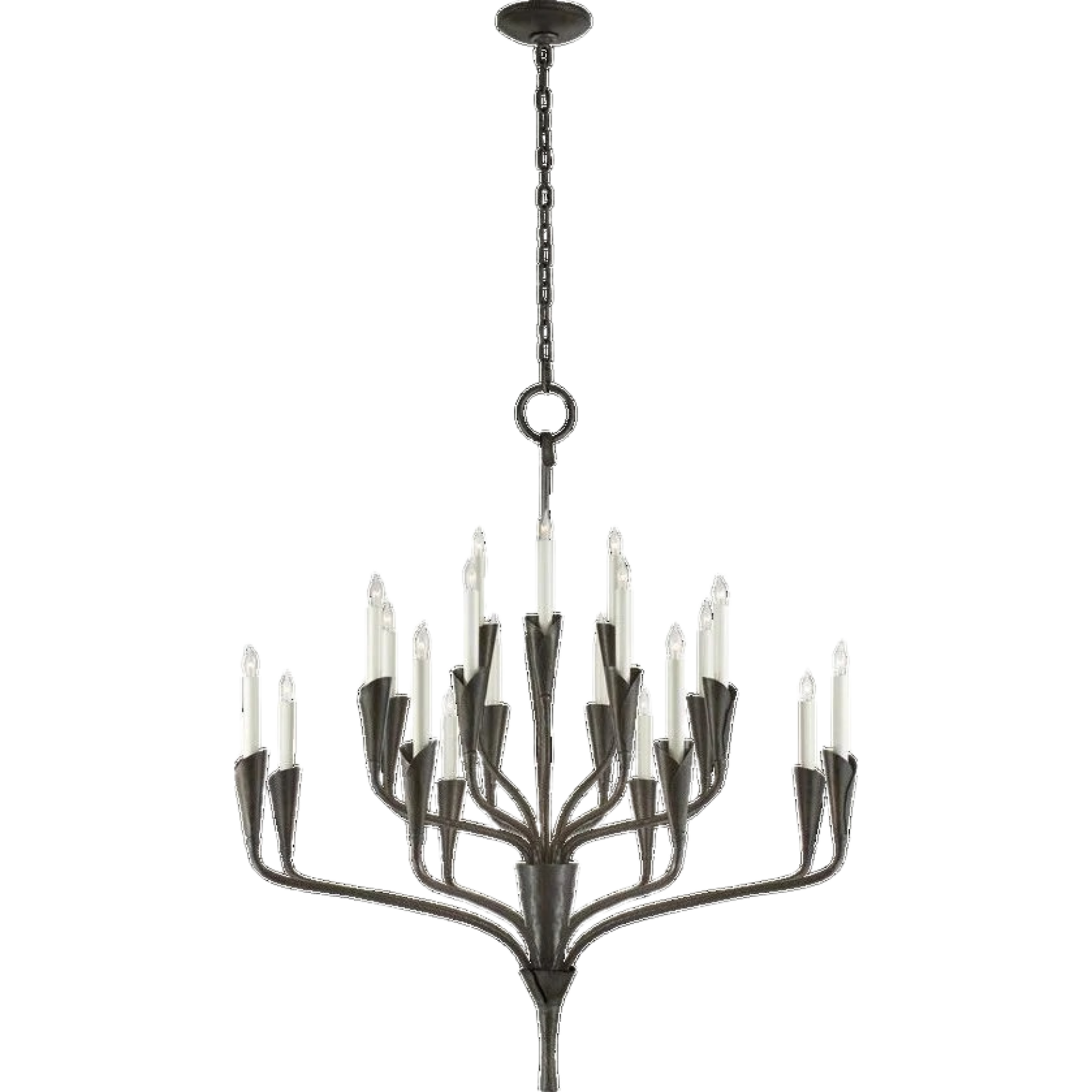 Featuring Aiden Large Chandelier by Visual Comfort at Amethyst Home. Effortlessly combining mid-century and medieval elements, Chapman & Myers' Aiden showcases hammered steel, manipulated with traditional hand-applied techniques to enhance its unexpected textures. The sculptural silhouettes boast details inspired by calla lilies that lend an organic touch to th. Amethyst Home provides interior design, new home construction design consulting, vintage area rugs, and lighting in the Tampa metro area.