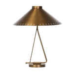 An antique brass iron dome is polished and finished with a perforated edge all around to bring a dose of industrial styling to this midcentury-inspired table lamp.
