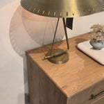 An antique brass iron dome is polished and finished with a perforated edge all around to bring a dose of industrial styling to this midcentury-inspired table lamp Amethyst Home provides interior design, new home construction design consulting, vintage area rugs, and lighting in the Miami metro area.