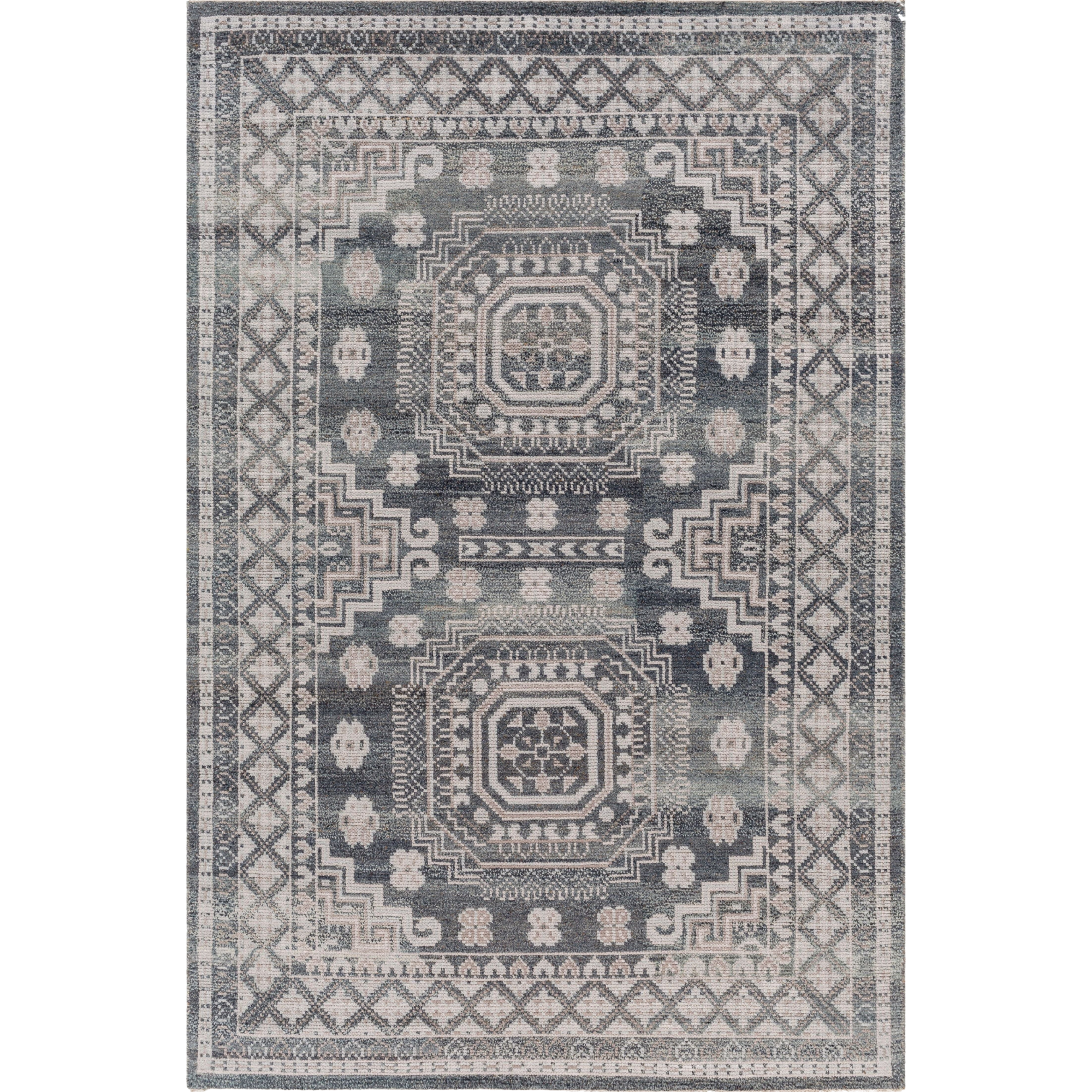 Featuring Almeria Charcoal Hand-Knotted Rug by Surya at Amethyst Home. The Almeria Rug Collection showcases traditional inspired designs that exemplify timeless styles of elegance, comfort, and sophistication. With their hand knotted construction, these rugs provide a durability that can not be found in other handmade constructions, and boasts the abi.  Amethyst Home provides interior design, new home construction design consulting, vintage area rugs, and lighting in the Salt Lake City metro area.
