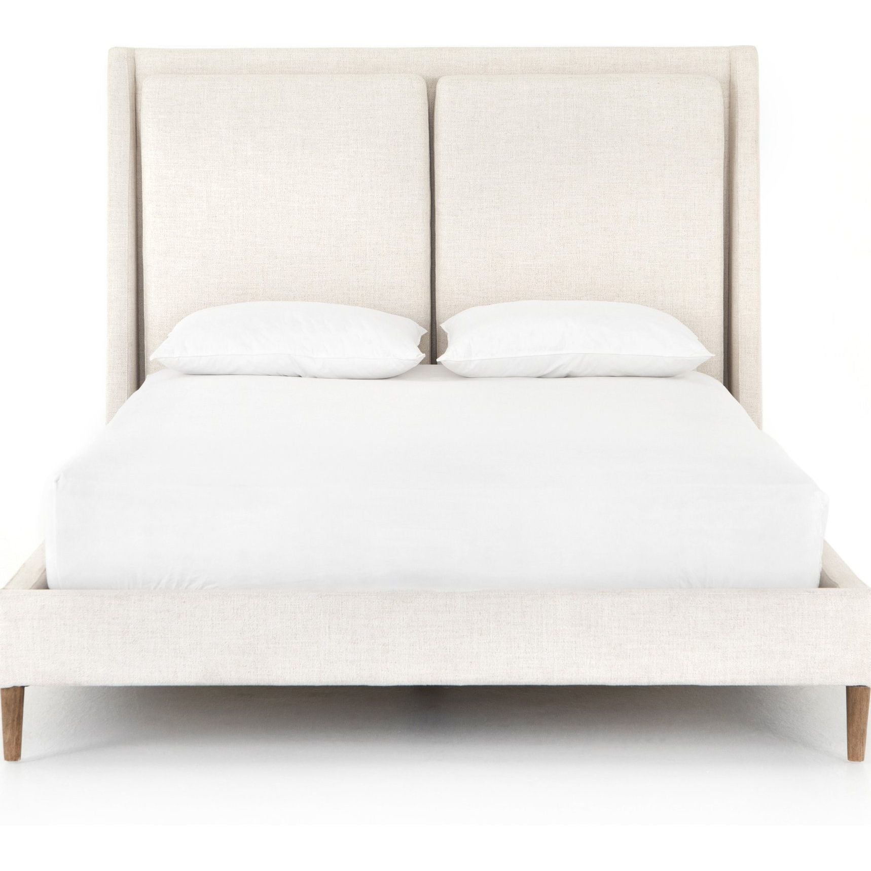 Welcome light, livable luxury into your bedroom with a fully upholstered bed. A tapered headboard features a fixed oversized cushion of high-performance fabric, creating a soft, layered look. Understated wooden legs complete the design. Performance fabrics are specially created to withstand spills, stains, high traffic and wear, ensuring long-term comfort and unmatched durability.