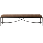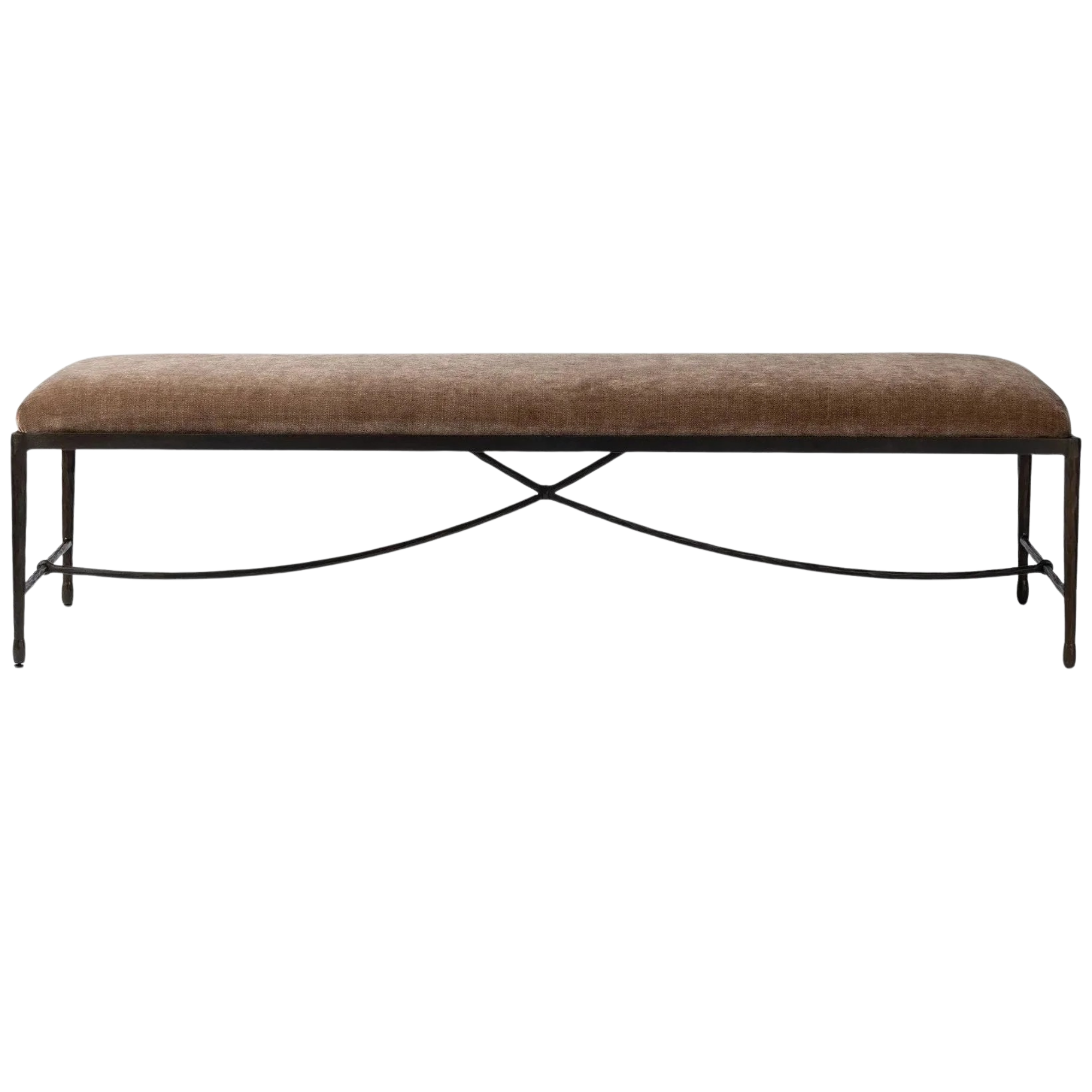 Channel Art Deco with a curved stretcher base of bronzed hammered iron and a velvety seat in a versatile earth tone. Style in the bedroom or entryway to create an extra surface, or in your living space for bonus seating.