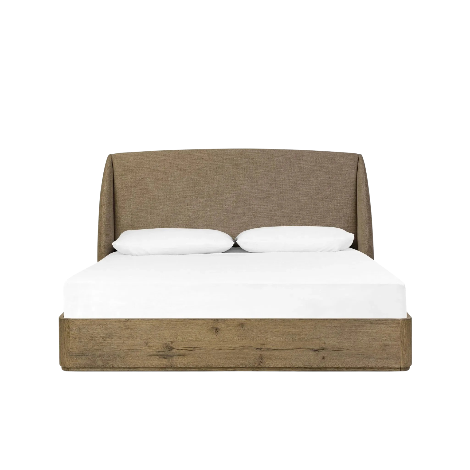 Clean lines meet contoured curves for a timeless bedroom look. A petal-shaped shelter overlaps side rails for a unique, comforting silhouette. Fully upholstered in a versatile taupe that complements a wide range of color palettes, all grounded by a rich oak base.