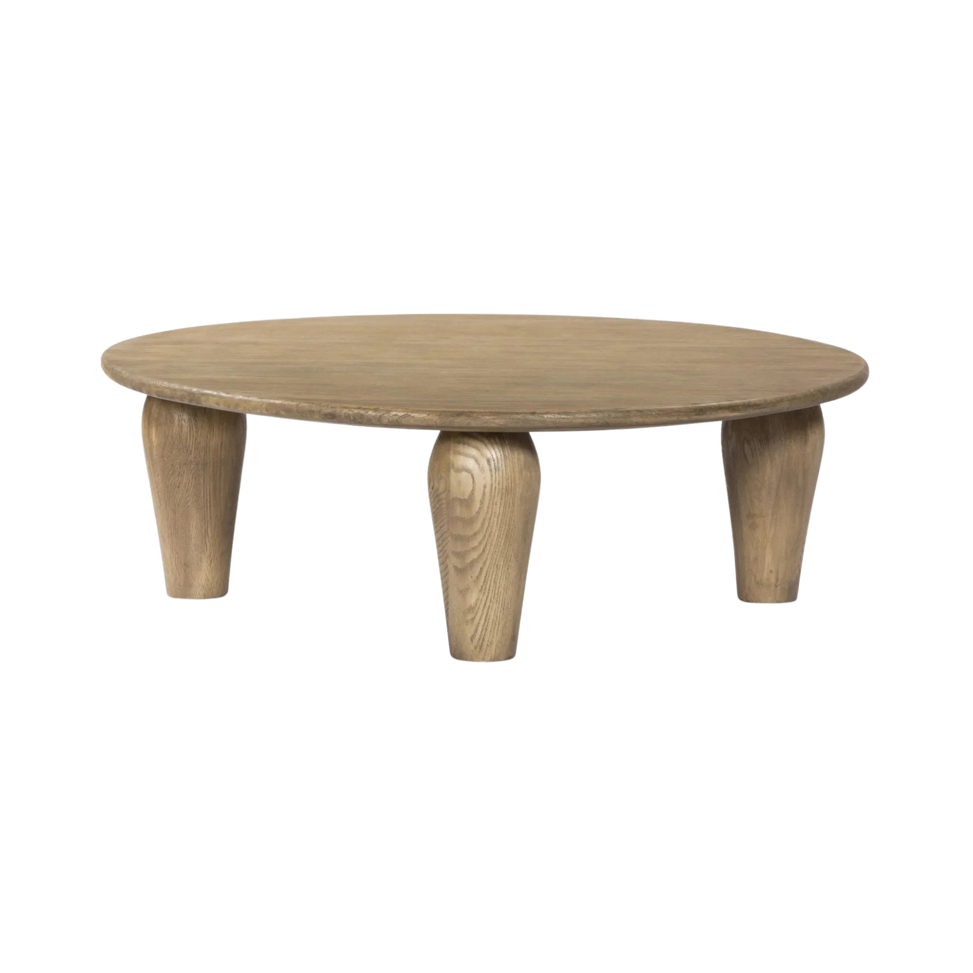 Featuring Maricopa Worn Oak Large Coffee Table by Four Hands at Amethyst Home. Play up proportions. Large, shapely legs support a rounded tabletop of worn oak, for a global, organic look and handcrafted feel. Overall Dimensions: 50.00"w x 50.00"d x 16.00"h. Amethyst Home provides interior design, new home construction design consulting, vintage area rugs, and lighting in the Tampa metro area.