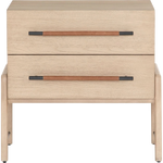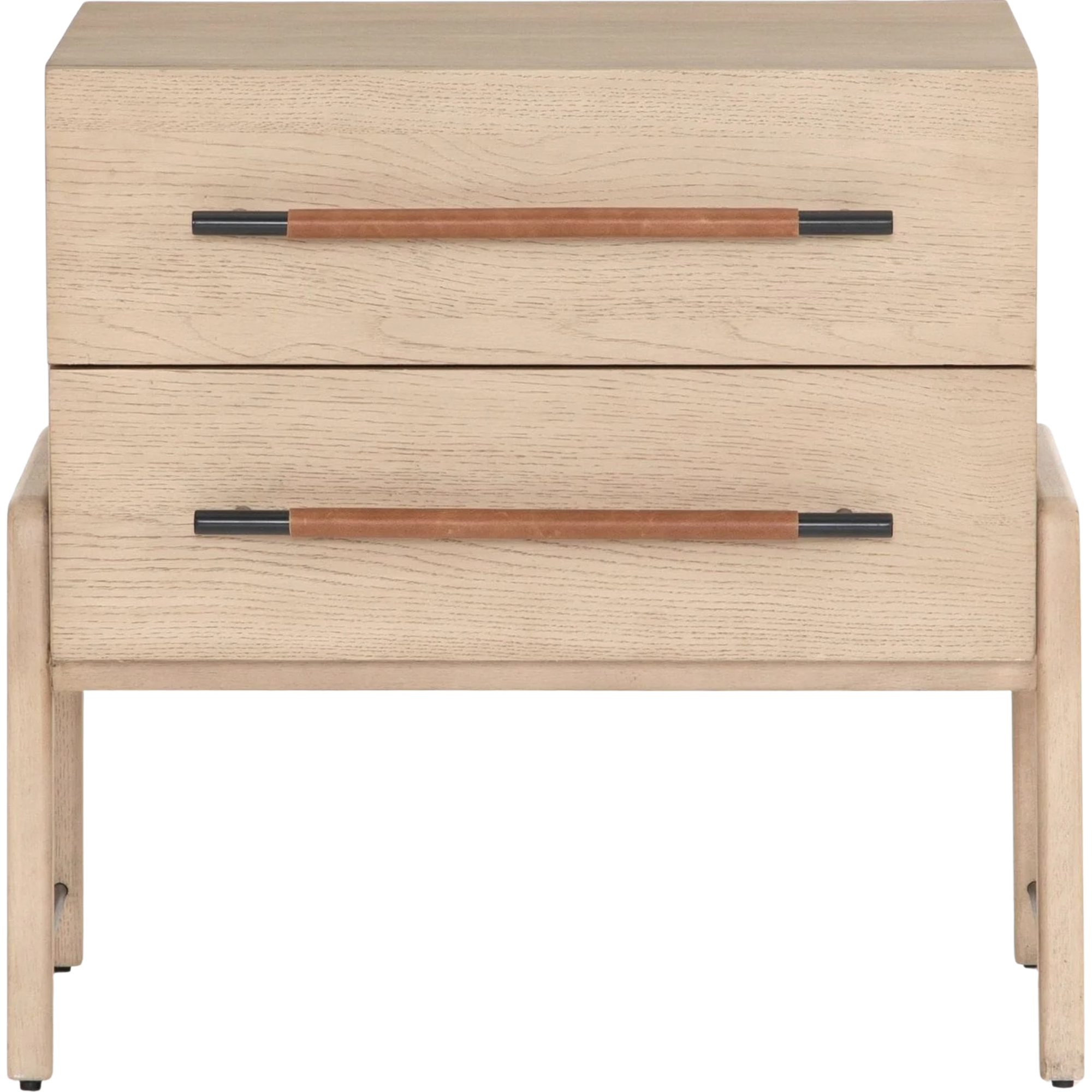 Featuring Rosedale Nightstand by Four Hands at Amethyst Home. The light-finished oak of this Rosedale Nightstand brings a clean, brightness to any room. We love how the two spacious drawers have iron hardware wrapped in a gorgeous, tan leather. The dimension legs with iron connecting them bring a unique look to your bedroom or other area!