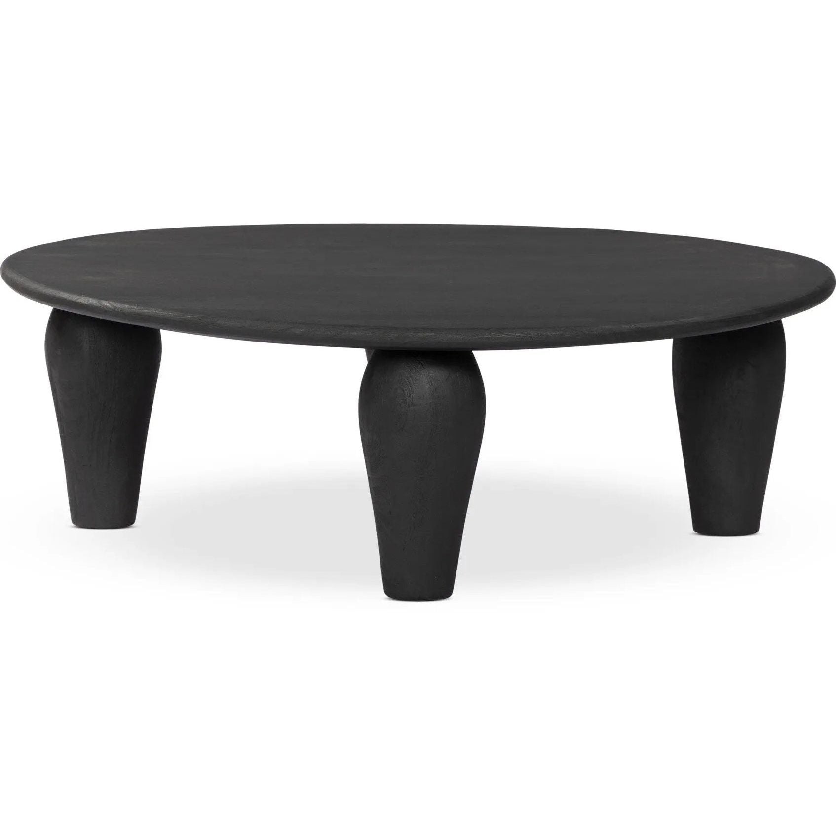 Featuring Maricopa Dark Totem Large Coffee Table by Four Hands at Amethyst Home. Play up proportions. Large, shapely, legs support a rounded tabletop of light black-finished solid reclaimed woods, for a global, organic look and handcrafted feel. Overall Dimensions: 50.00"w x 50.00"d x 16.00"h. Amethyst Home provides interior design, new home construction design consulting, vintage area rugs, and lighting in the Calabasas metro area.