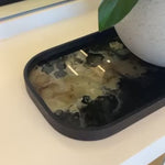 A subdued color palette meets captivating motifs inspired by nature and travel. This Black Organic glass valet tray experiments with the balance between rich patterns offset with muted tones, revealing the beauty behind the deceivingly ordinary subjects from which inspiration is drawn. In doing so, this collection captures the essence of timelessness.