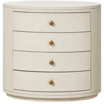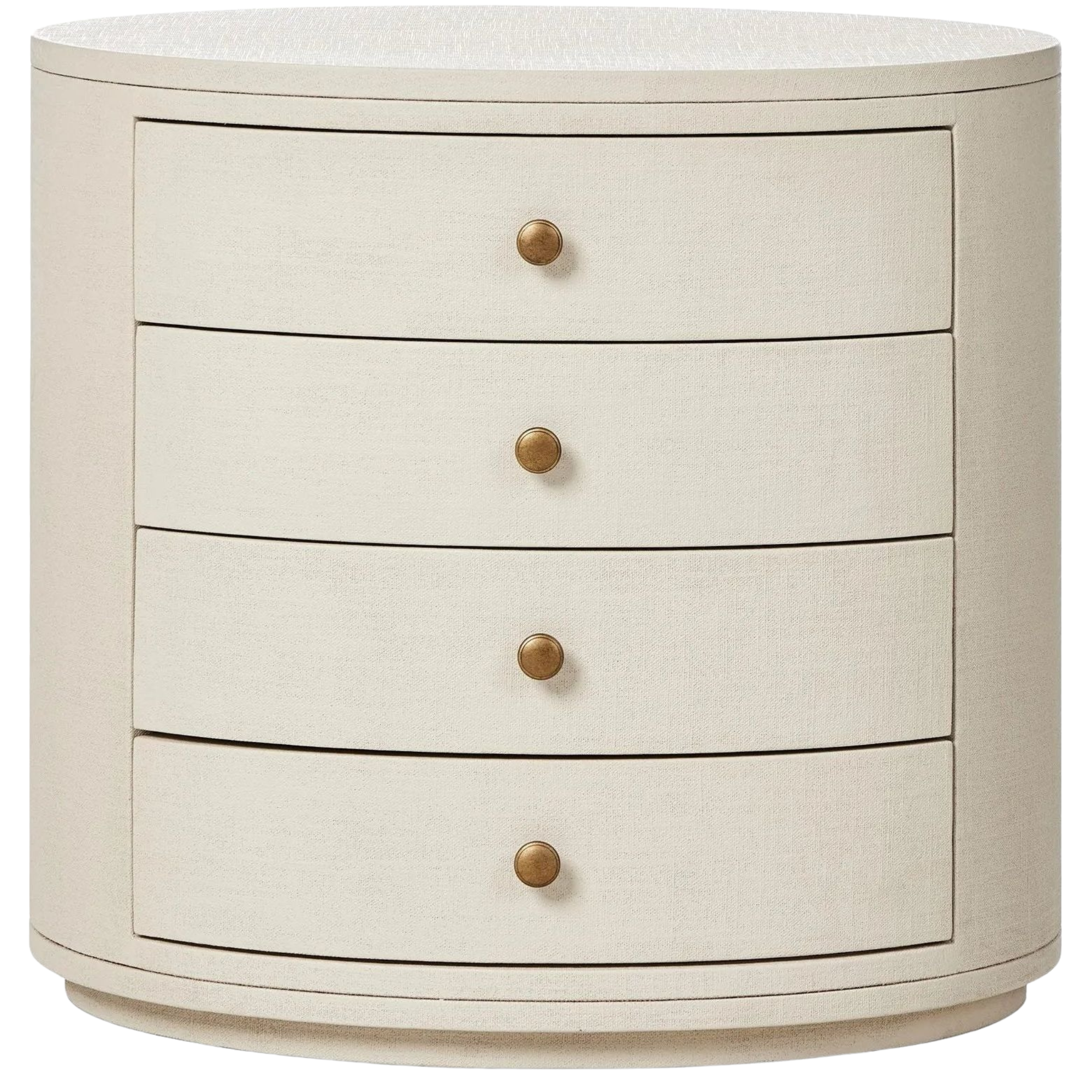 Uniquely made from ivory-painted linen, a beautifully curved nightstand shapes four drawers for generous bedside storage.