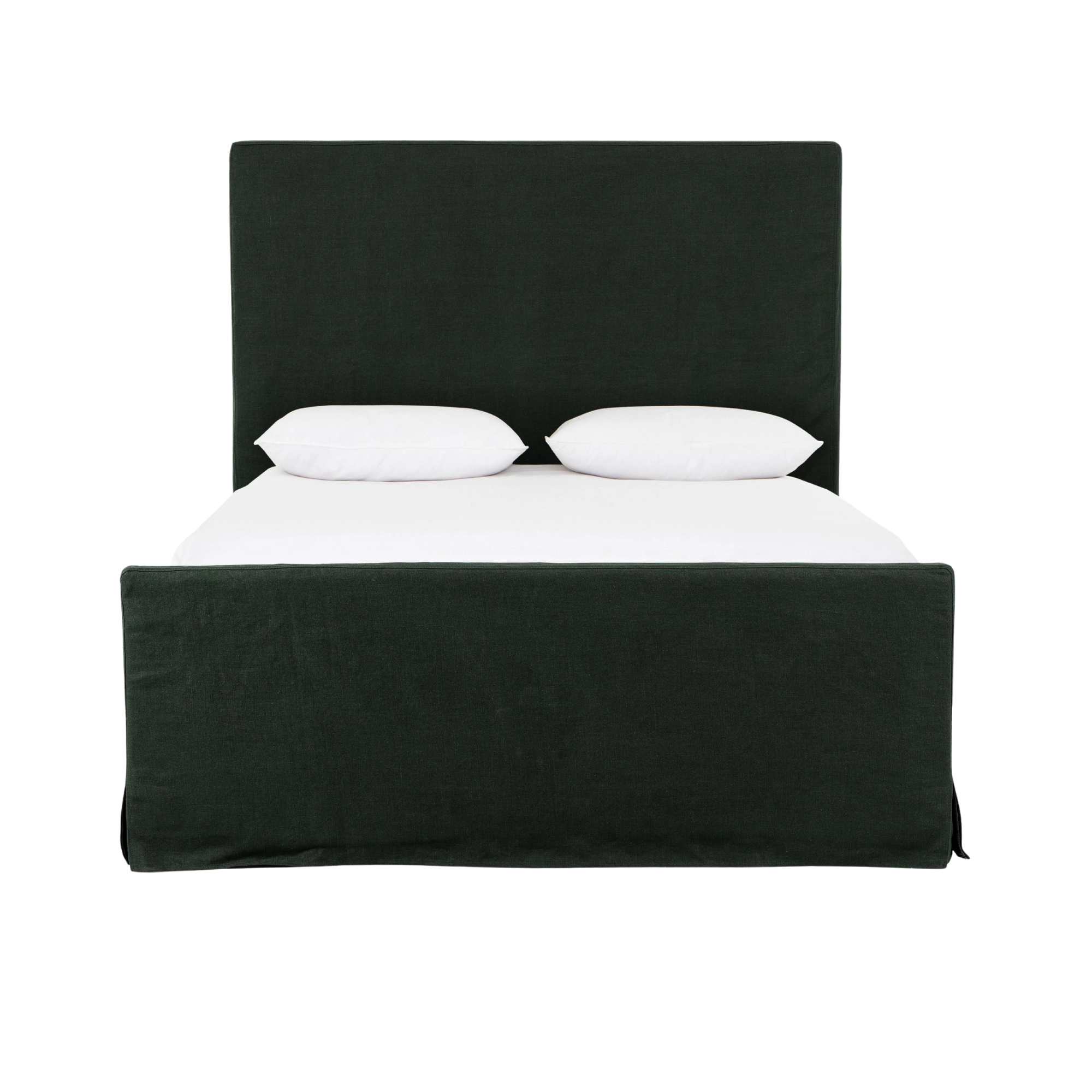Slipcovered bed upholstered in sustainably made Belgian Linen. Naturally durable and soft to the touch, Libeco-sourced linens are artisan-made and free of toxic chemicals. Slipcovered styles are fully removable and machine-washable for easy care.
