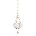 Celebrating the beauty of natural materials, the sophisticated Amberley pendant features a unique natural rope suspension and ethereal opal matte glass shade. Resembling a quatrefoil shape from above, the shade has four scalloped edges that nod to its botanical underpinnings. From the ceiling, the rope cradles the shade, culminating in an elegant tassel at the bottom. A central stem finished in Vintage Gold Leaf adds to the warm tonality of Amberley.
