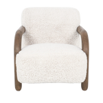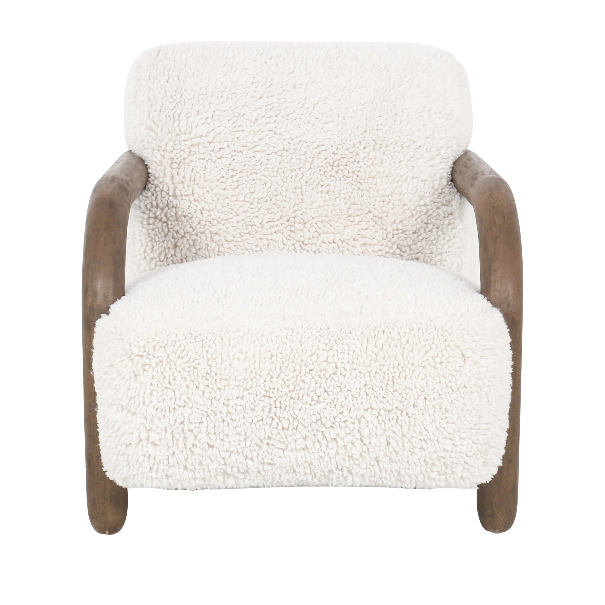 This versatile accent chair is upholstered in a faux Mongolian shearling with a textural high pile. A contrasting, chunky parawood frame hugs the seat and is wire-brushed for a warm, vintage feel.