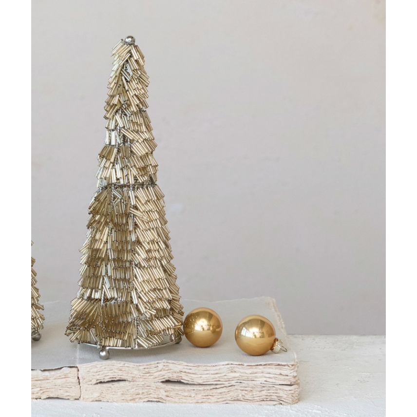 This wire and glass bead Christmas tree in gold and nickel is a stunning ornament that will bring some color and charm to the home. It features a wire and glass bead Christmas tree that has a smooth and glossy finish that reflects light. The tree is decorated with gold and nickel beads that add some texture and flair. The tree has a simple and elegant design that suits any style of decor. The ornament stands on a base, which adds some contrast and stability.