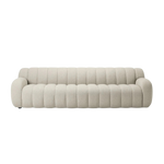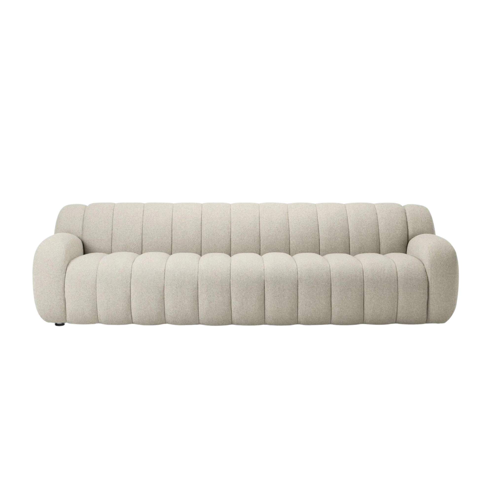Grand in scale and comfort, this plush sofa features wide dramatic channeling for extra volume and a cloud-like look and sit. Covered in a recycled olefin fabric, known for its UV-resistant, water-repellent and quick-drying abilities, in a Turkish weave with a classic tweed feel.