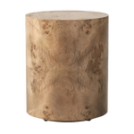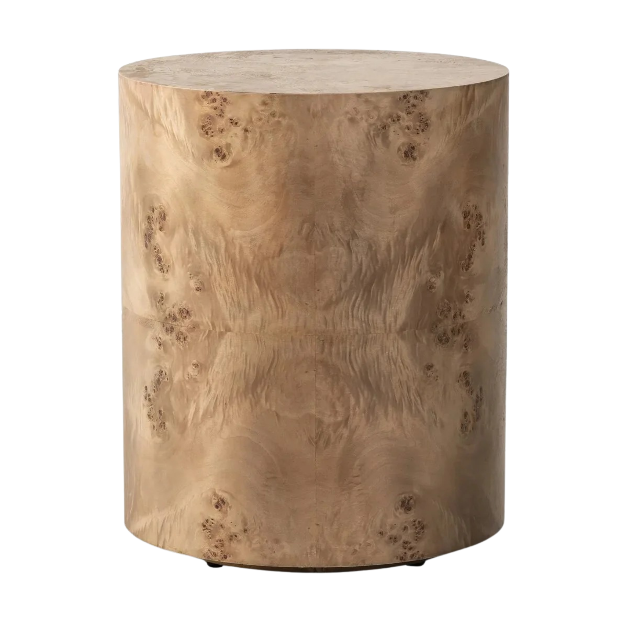 A simple drum shape showcases the natural artistry of the richly grained caramel burl veneer. Its compact size is ideal for smaller spaces.