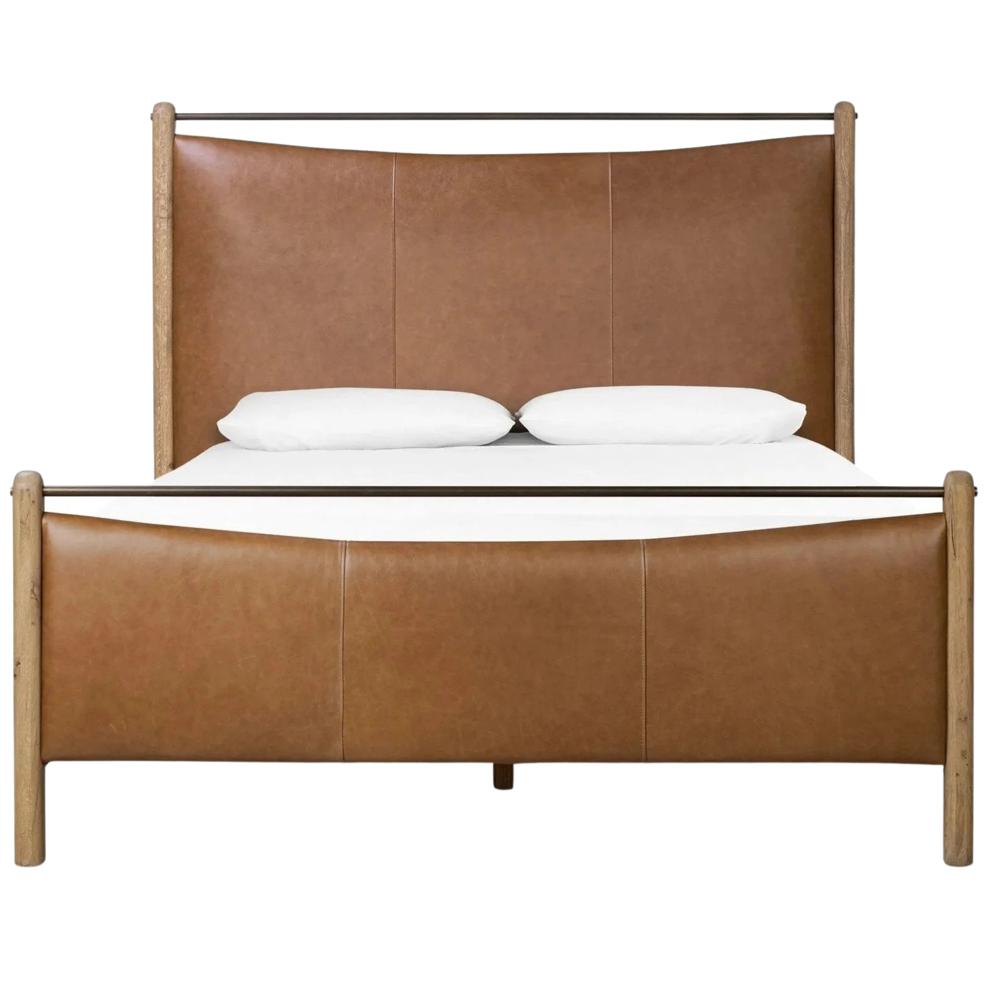 Slightly scooped top-grain leather tufting is bridged with metal bars in brushed brass for modern detailing. Aged smoked oak frames the three-paneled headboard and footboard wrapped in chestnut top-grain leather. Rounded legs soften the look Amethyst Home provides interior design, new home construction design consulting, vintage area rugs, and lighting in the Des Moines metro area.