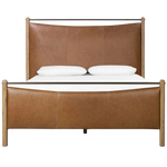Slightly scooped top-grain leather tufting is bridged with metal bars in brushed brass for modern detailing. Aged smoked oak frames the three-paneled headboard and footboard wrapped in chestnut top-grain leather. Rounded legs soften the look.