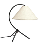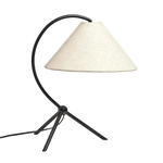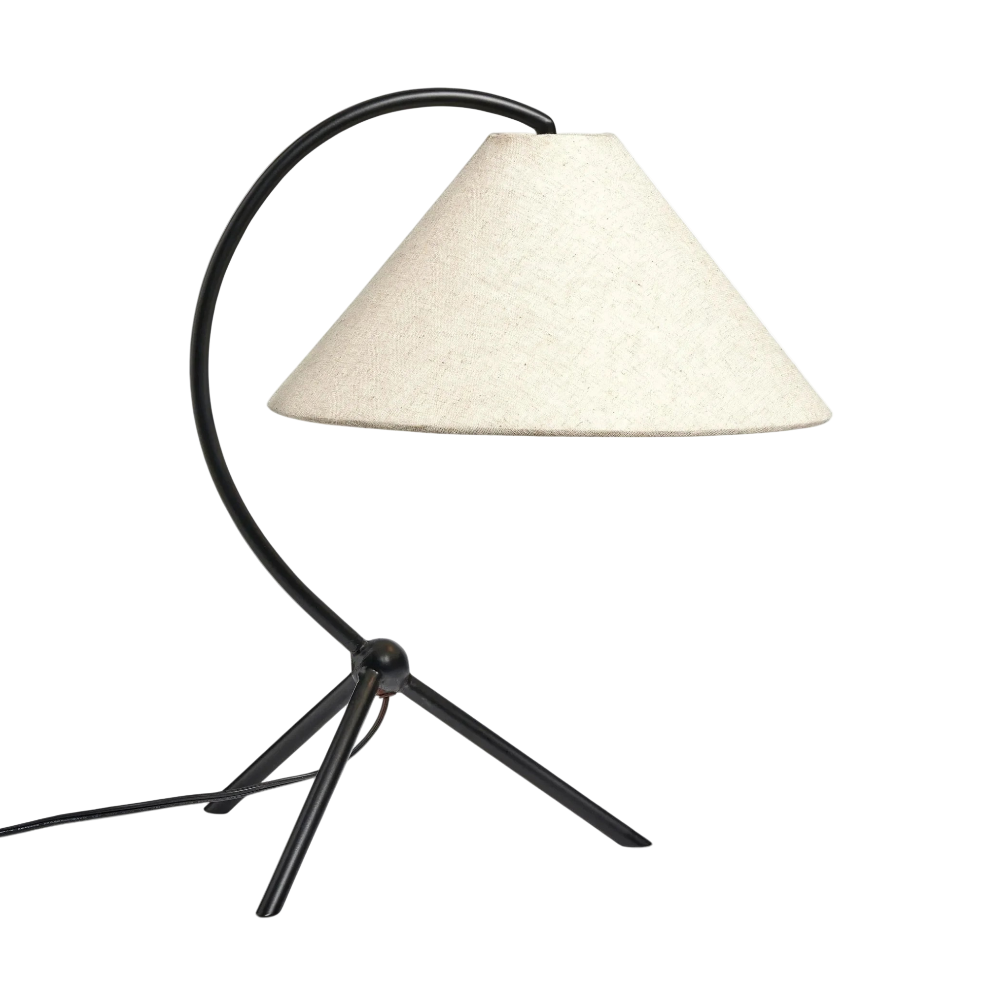 A dramatically curved silhouette and tripod base of matte black metal pair with a flax linen shade for a shapely, minimalist feel.