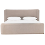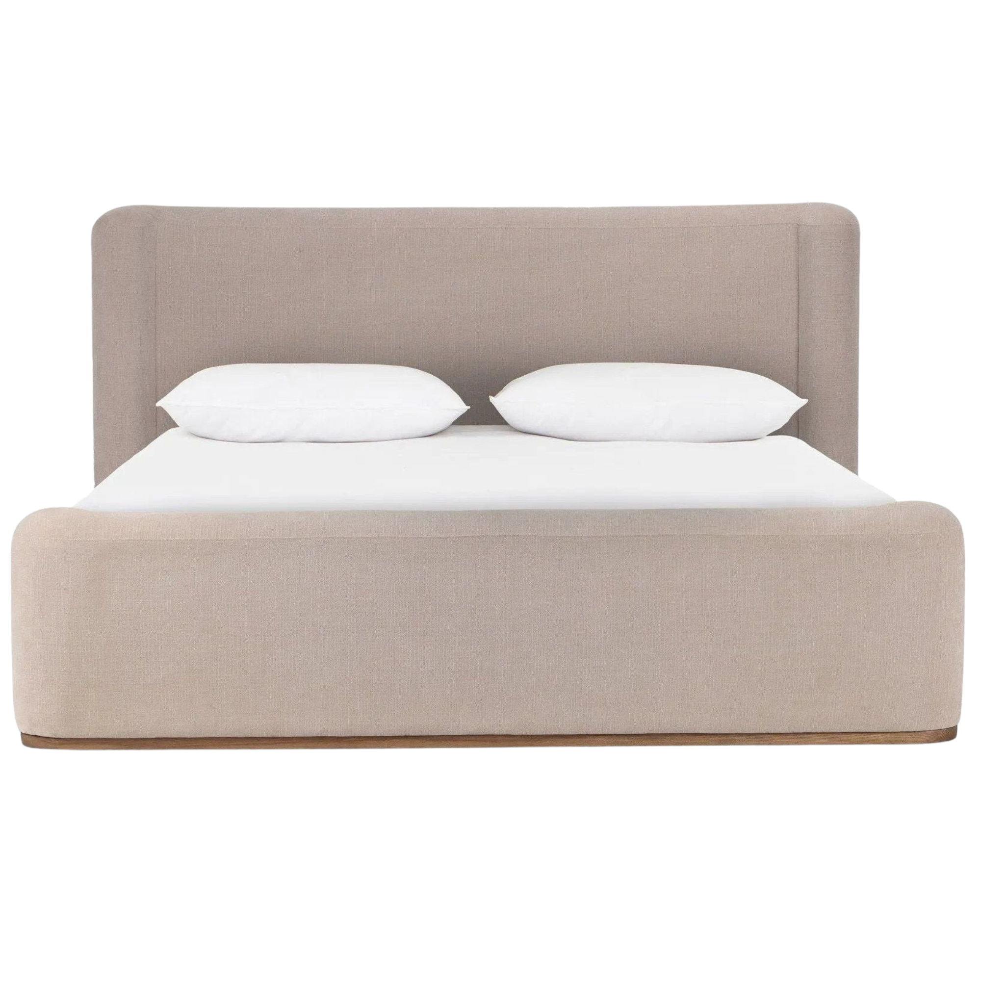 Featuring Fane Holland Sand Bed by Four Hands at Amethyst Home. A transitional style to complement your collection, sheltered head and footboards shape a soft, contour-inspired silhouette, grounded by a plinth ash base. With clean lines and all-around cushioning, this upholstered bed brings an inviting look to the bedroom. Overall Dimensions: Queen: