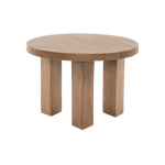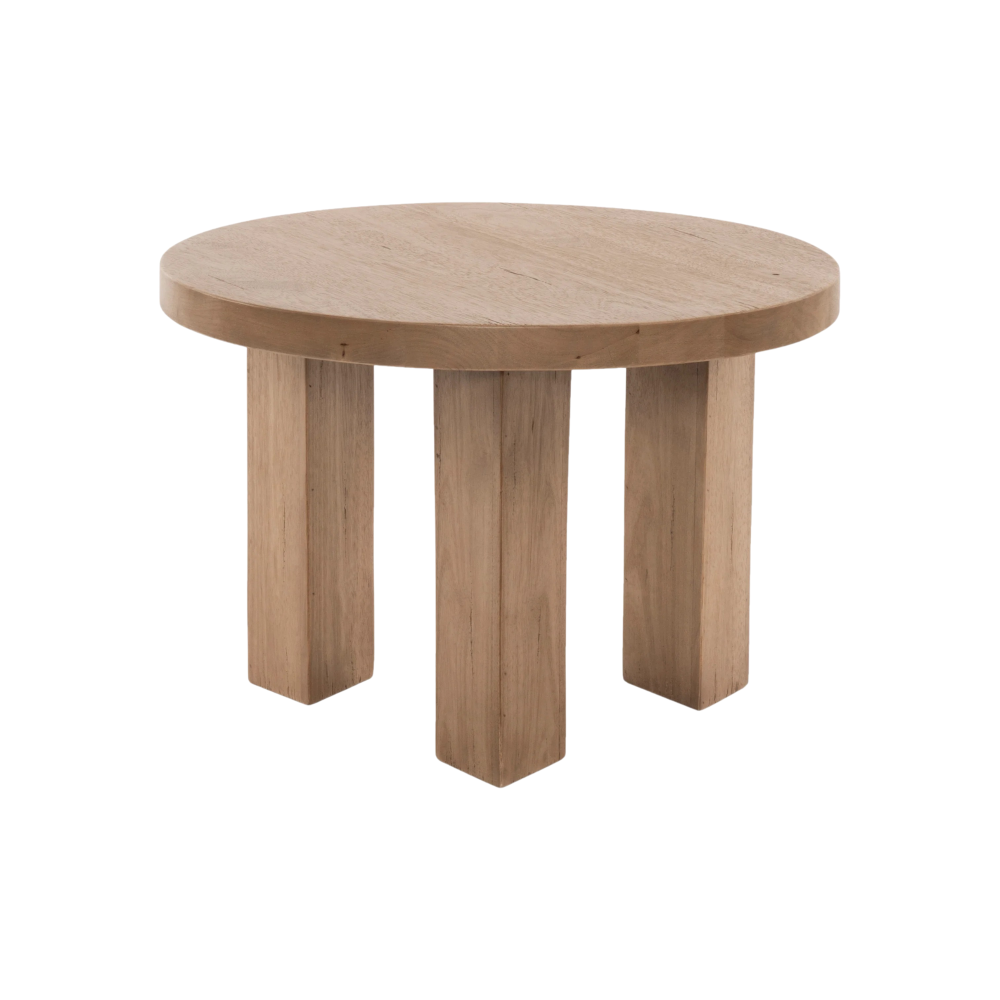 The perfect place to keep a drink or book within reach, light-brushed parawood forms a rounded tabletop, with thick, triangular pedestal legs inspired by modern European design.