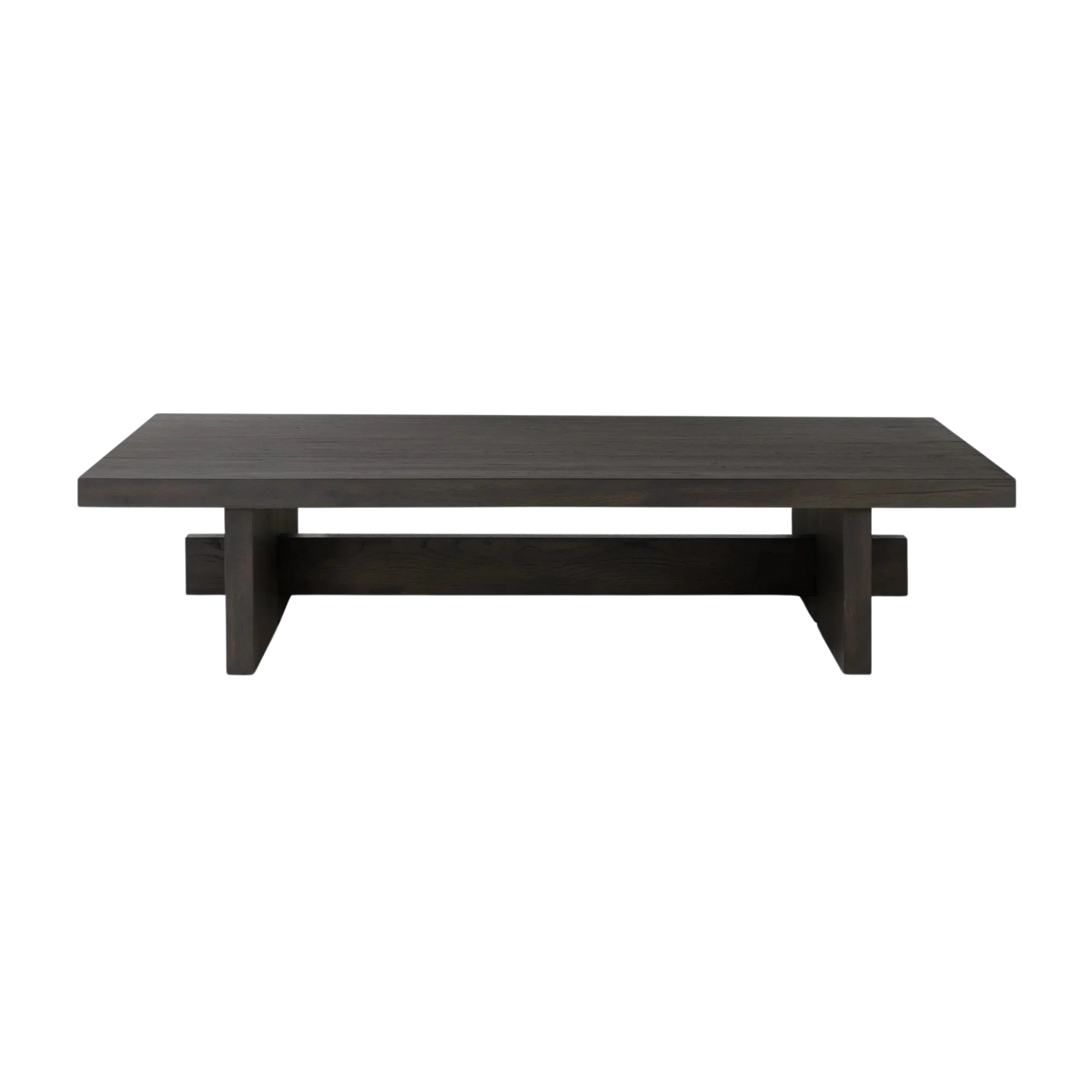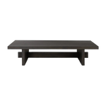 A substantially sized coffee table of smoked black oak features joint and connection construction for a design-forward look. Visible knots and graining add character.