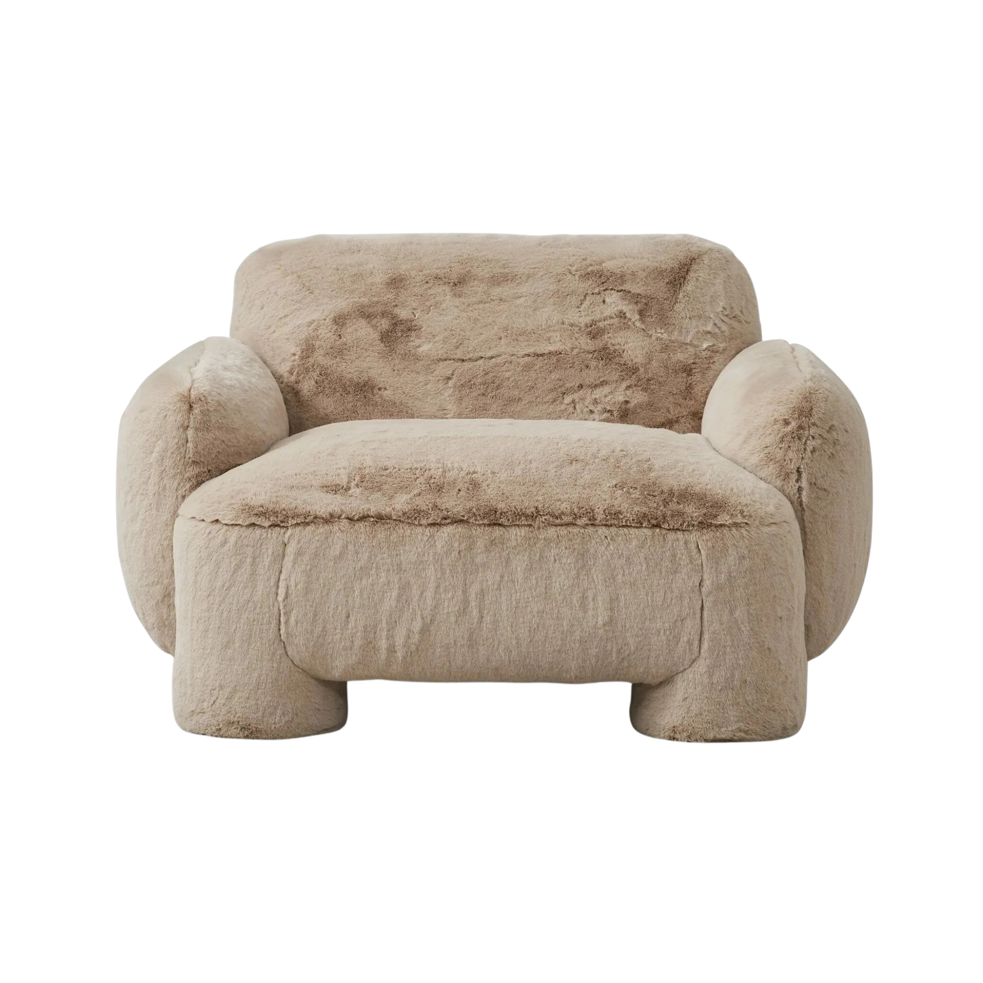 Oversized and modern, this arm chair is a statement piece whether styled alone or with an existing living room setup. The neutral faux fur covering subdues bold arms and cylindrical legs. With spring suspension in the seat cushion and webbed suspension in the back, the piece is designed with durability and comfort in mind.
