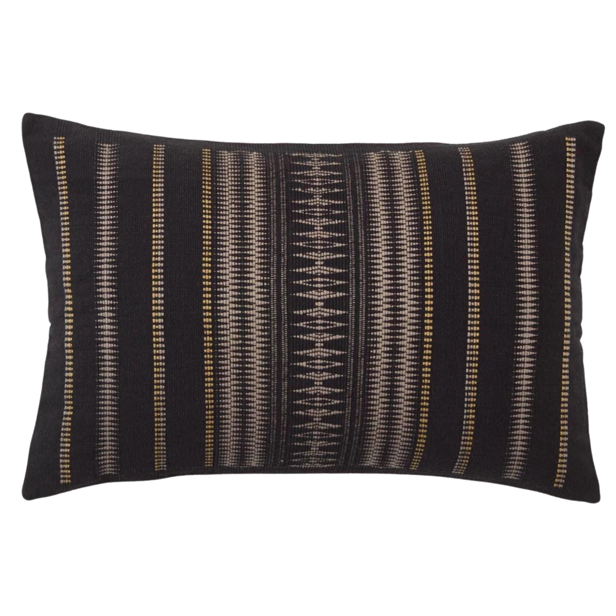 Featuring Nagaland Pillow Dzukou Pillow by Jaipur Living at Amethyst Home. Handmade by weavers in Nagaland, India, the Nagaland Dzukou showcases the traditional loin-loom techniques of the indigenous tribes of the region. The artisan-made Dzukou throw pillow effortlessly combines heritage-rich tribal and stripe patterns with a black, taupe, and gold colorw. Amethyst Home provides interior design, new home construction design consulting, vintage area rugs, and lighting in the Scottsdale metro area.