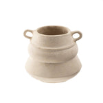 The Naturi Paper Mache Vase is handcrafted from eco-friendly papier mache and has a chalky, limewash like texture. Its primitive and curvaceous form is complemented with decorative handles and stands out when layered with other decor accents objects of differing shapes and finishes. 8.5 x 8 x 7 in Made from recycled newspaper, they are entirely natural and sustainable. First the newspaper is mixed with water, then chalk and tree sap crystals are added to turn the substance into a clay-like material. The pulp is kneaded into chapati-like forms, then rolled and moulded into the sculptural objects we love. There is no firing, no power used, and the process is entirely eco-friendly. Each piece will have subtle differences in finish and these variations are part of the handmade appeal. Porous in nature, papier mache should not be exposed to liquids.