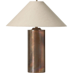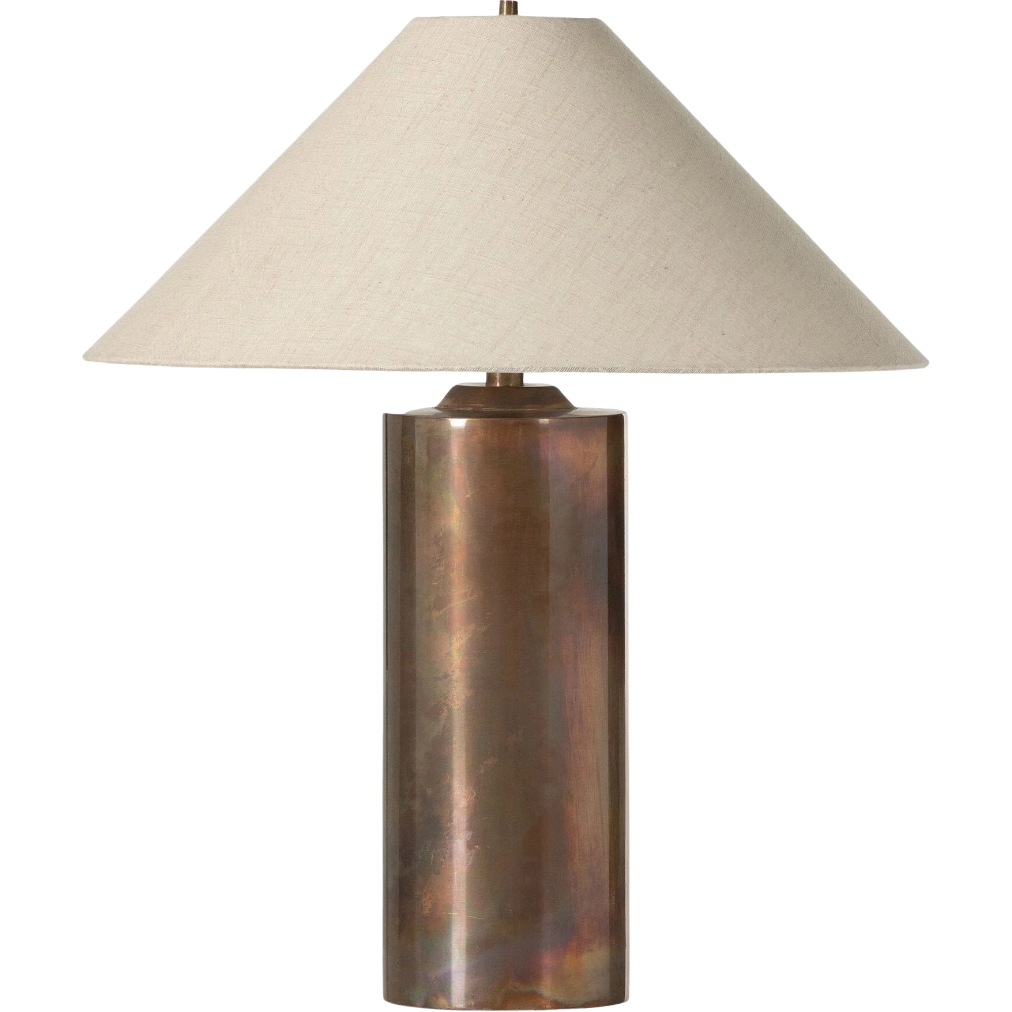 All-metal table lamp finished with a unique process to accomplish its iridescent acid wash look. The metal is first polished, then oxidized. It's finished with a heating process and lacquer seal for an antiqued look, complemented by a simple linen shade.