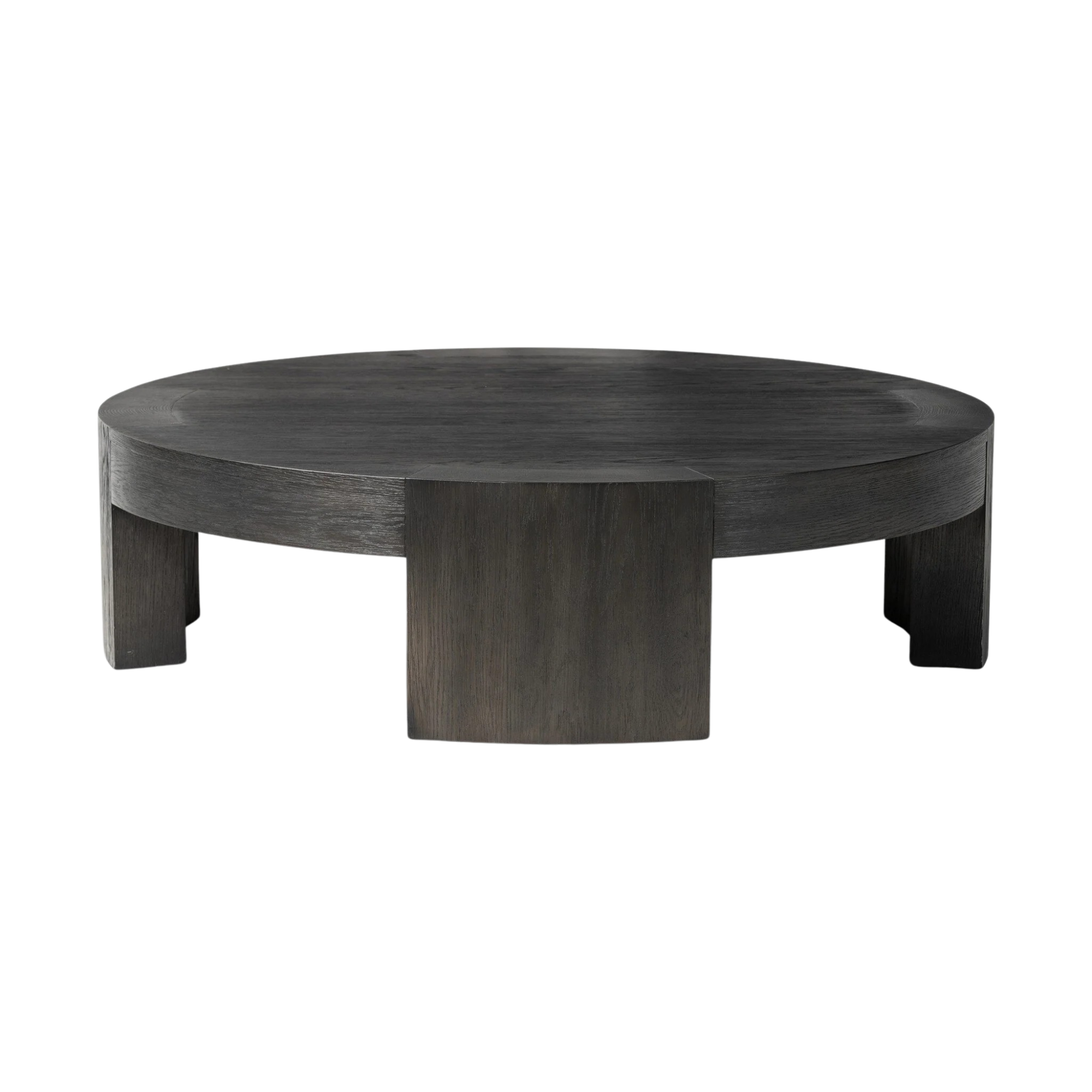 Made from thick, charcoal-finished oak, a rounded coffee table features four legs that pull through to the top, for an intriguing design detail.