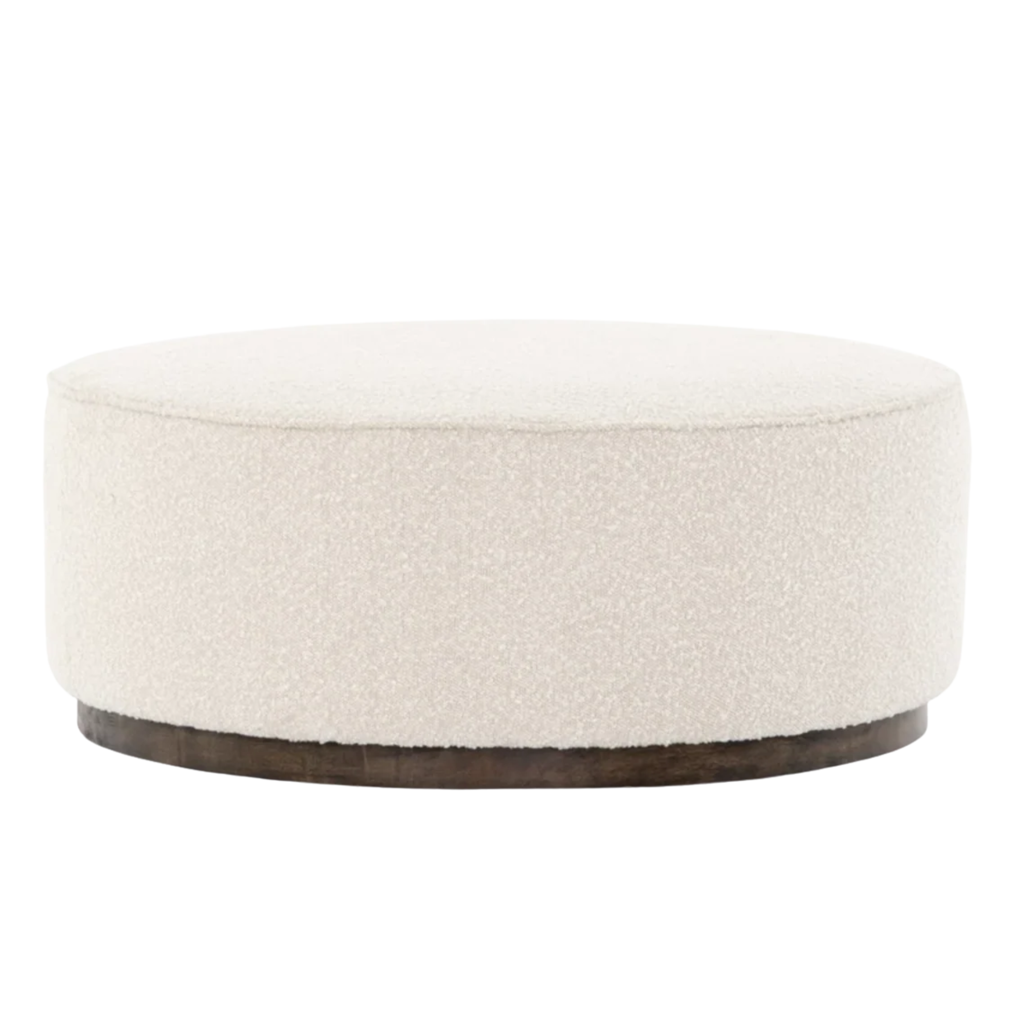 This firm round ottoman of textural cream boucle makes a great coffee table or closet bench!