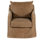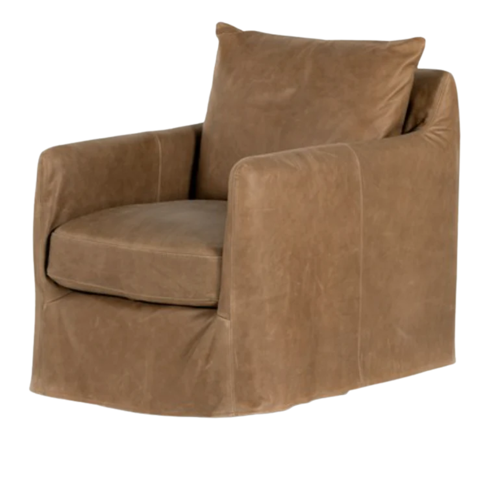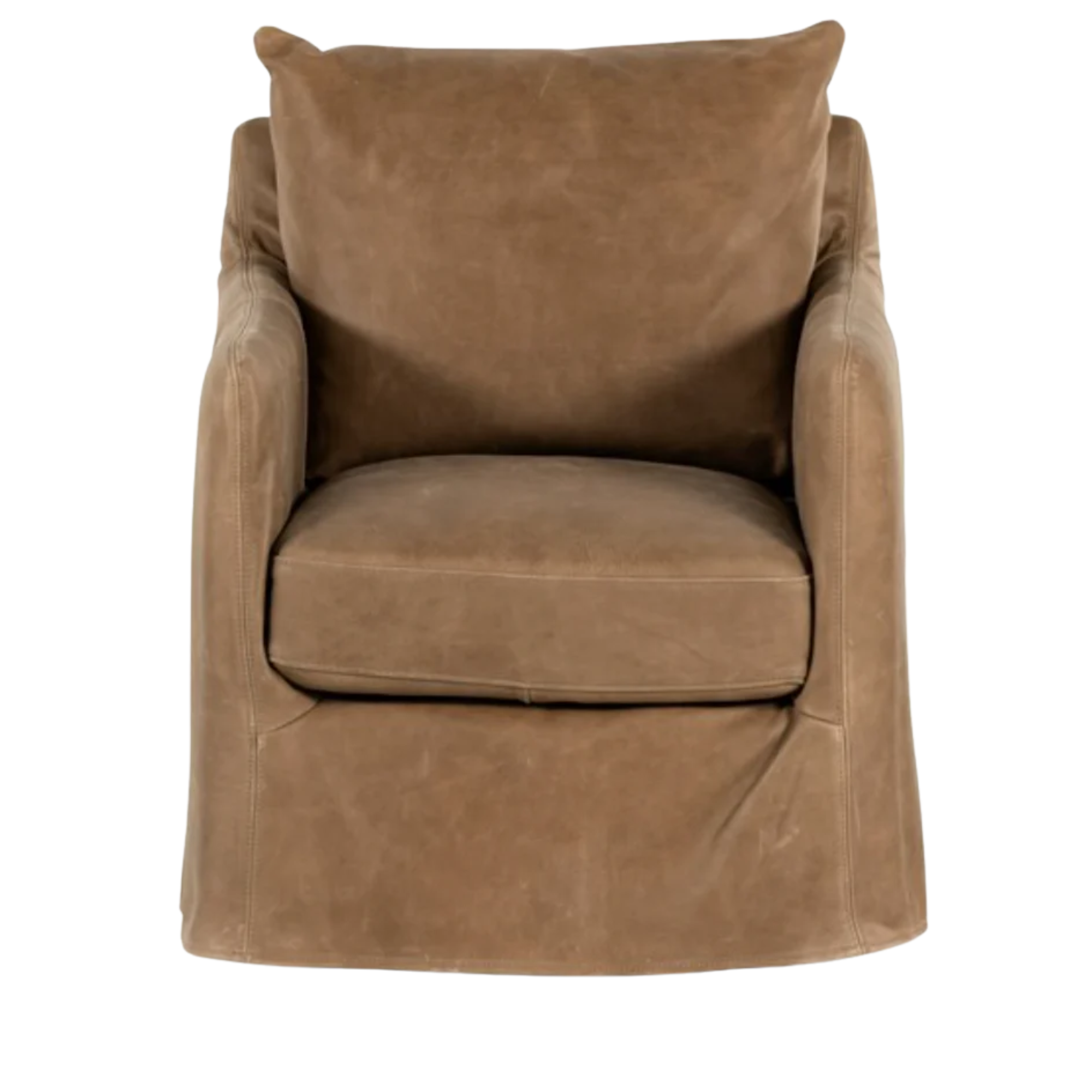 The Freddy Leather Swivel Chair is a slipcovered, leather swivel chair -- perfect for moody rooms. The chair features a comfortable, plush back and supportive seat. Please expect natural distressing.
