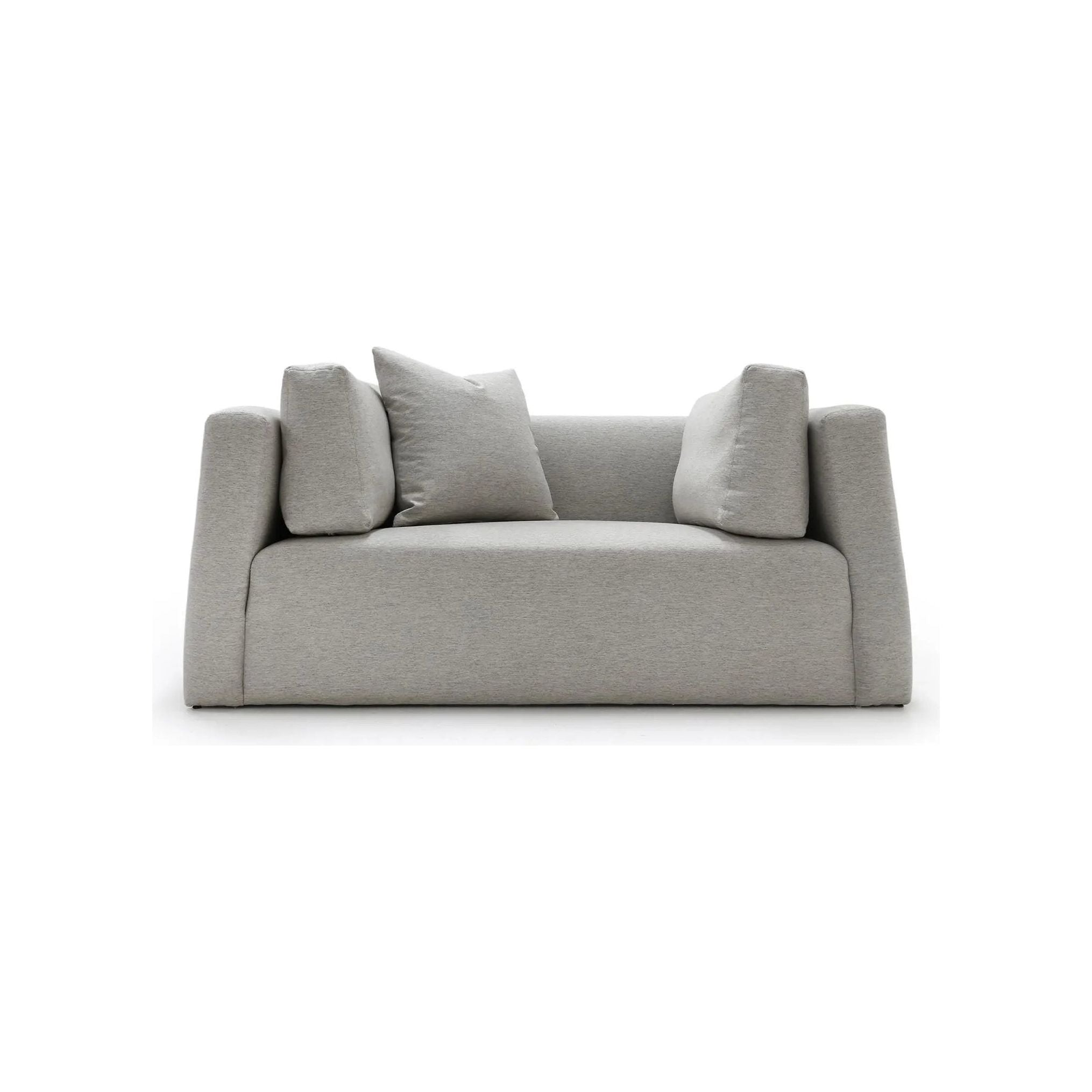 The Clemence Loveseat features a minimalist design with clean, low-profile lines, complemented by plush cushions and luxurious throw pillows.
