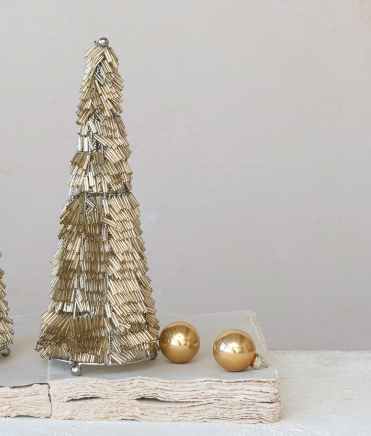 This wire and glass bead Christmas tree in gold and nickel is a stunning ornament that will bring some color and charm to the home. It features a wire and glass bead Christmas tree that has a smooth and glossy finish that reflects light. The tree is decorated with gold and nickel beads that add some texture and flair. The tree has a simple and elegant design that suits any style of decor. The ornament stands on a base, which adds some contrast and stability.