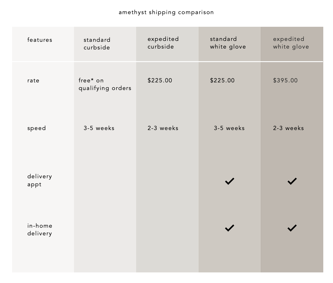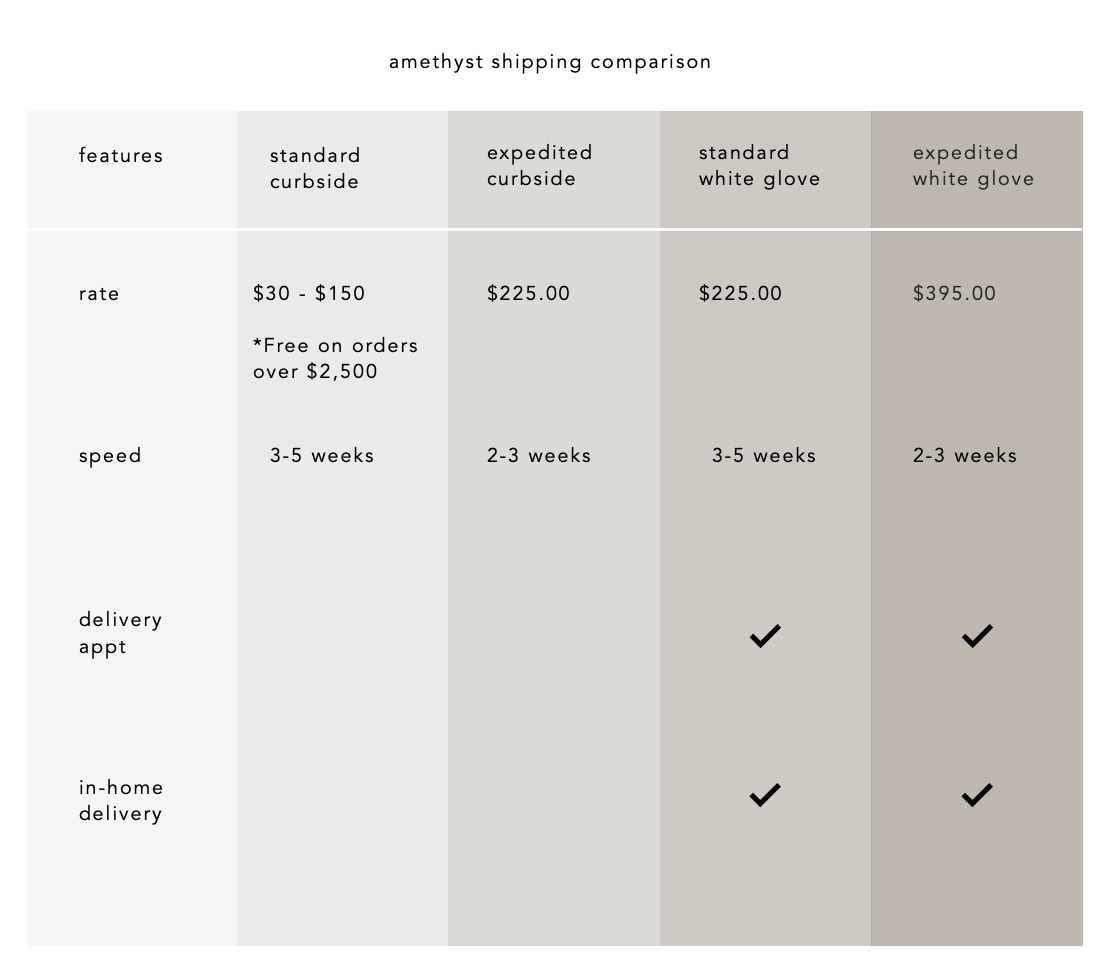 Furniture, Art, Lighting - Available for freight delivery in Canada & USA. For Europe and Australia customers, we offer a per piece rate of $750 USD to deliver with a minimum order of $3000 USD. Please contact our team at design@amethysthome.com for a personalized invoice.