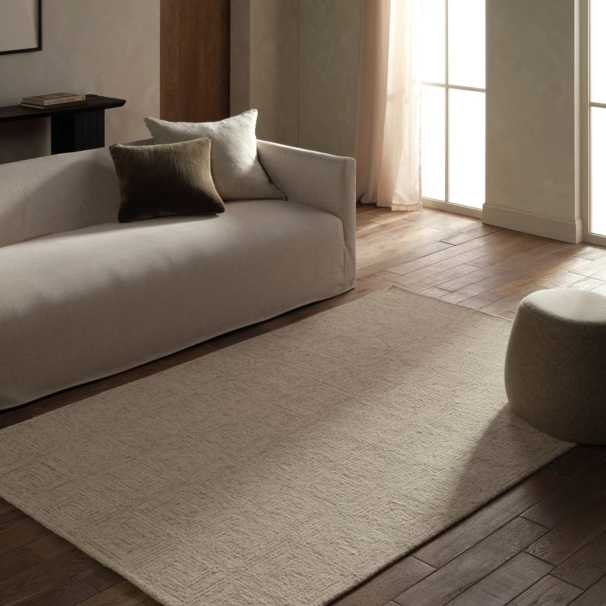 The Kafes collection embraces minimalist geometry with a modern, tranquil aesthetic. The Aleric design is tufted directionally to form strong, harmonious lines, creating concentric rectangles that radiate outward. Balancing structured design with natural fluidity, this breathable piece allows air to flow freely through its fibers, creating a grounded yet effortlessly organic aesthetic.