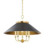 This classic metal shade design feels special with fresh finish combinations and sleek, heritage-inspired details. The contrastiing Aged Brass accents and modern gooseneck arm allow the pendants and sconce an updated, yet classic feel. The tapered shade over a five-light candelabra give the chandelier new traditional appeal. Each fixture features an Aged Brass or Polished Nickel shade that is metal on the inside and painted Off-White, Distressed Bronze or Bird Blue on the outside. Part of our Mark D. Sikes collection.