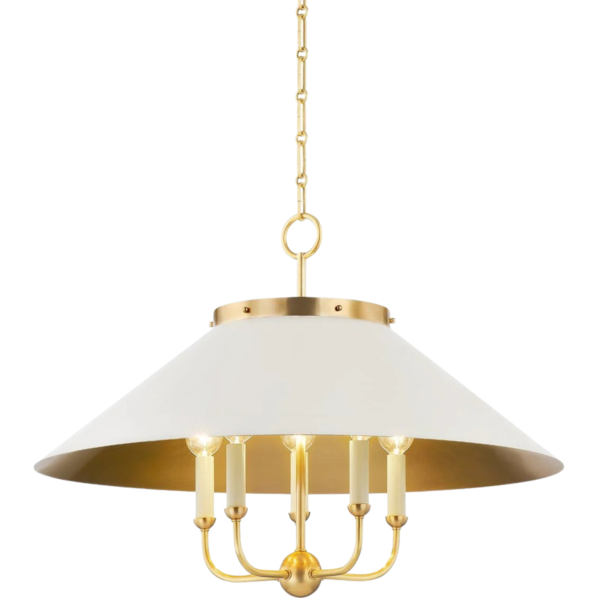 This classic metal shade design feels special with fresh finish combinations and sleek, heritage-inspired details. The contrastiing Aged Brass accents and modern gooseneck arm allow the pendants and sconce an updated, yet classic feel. The tapered shade over a five-light candelabra give the chandelier new traditional appeal. Each fixture features an Aged Brass or Polished Nickel shade that is metal on the inside and painted Off-White, Distressed Bronze or Bird Blue on the outside. Part of our Mark D. Sikes collection.