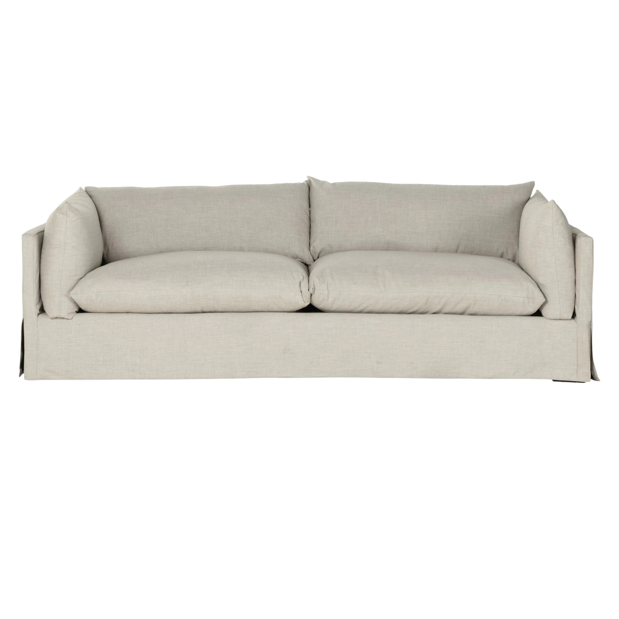 Featuring Habitat Bennett Moon Sofa by Four Hands at Amethyst Home. A slipcovered sofa made for modern living. Shelter arms and big, pillow-inspired cushions are covered in a durable, comfortable fabric prime for lounging. Performance fabrics are specially created to withstand spills, stains, high traffic and wear, ensuring long-term comfort and unmatched durab. Amethyst Home provides interior design, new home construction design consulting, vintage area rugs, and lighting in the Miami metro area.