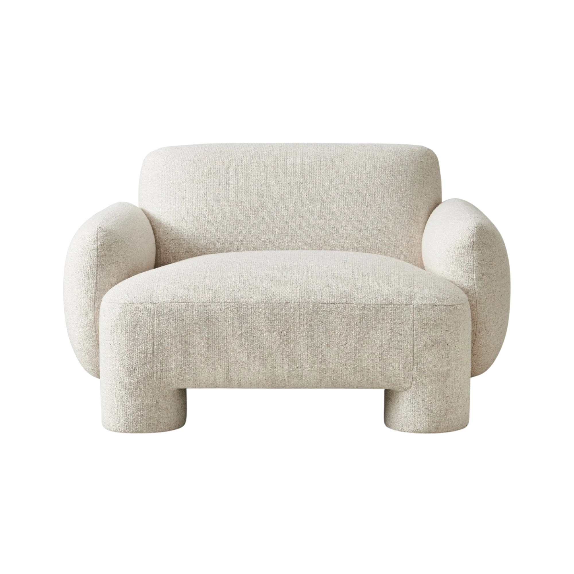 Oversized and modern, this arm chair is a statement piece whether styled alone or with an existing living room setup. The cream basketweave covering subdues bold arms and cylindrical legs. With spring suspension in the seat cushion and webbed suspension in the back, the piece is designed with durability and comfort in mind.