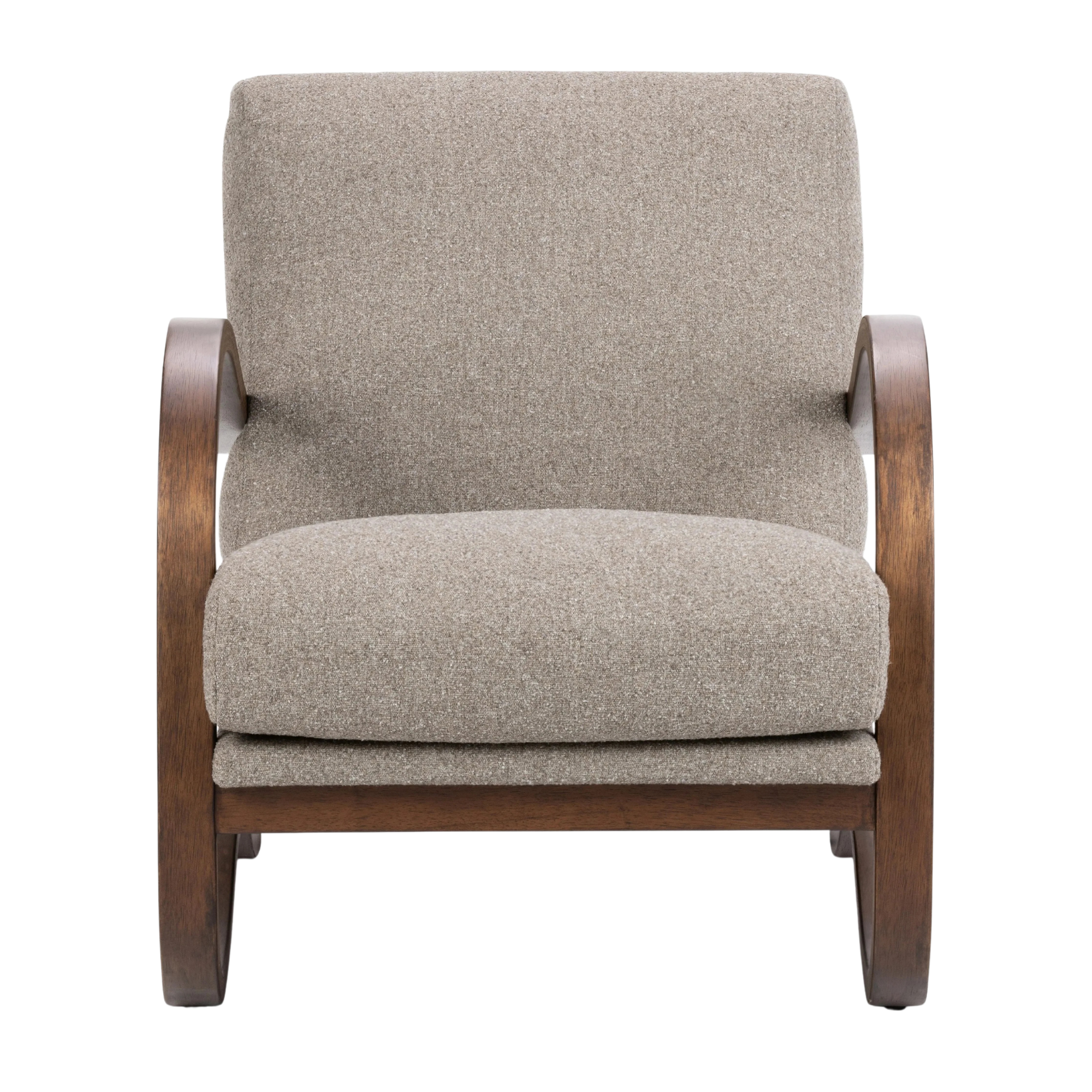 Inspired by vintage rocking chairs, the whimsical frame of this accent chair hugs removable plush feather foam-blend cushions on a webbed suspension style construction for true sink-in comfort. Cushions are upholstered in a new Turkish-made fabric made from 100% recycled olefin yarns with a tweed-like texture and feel.