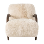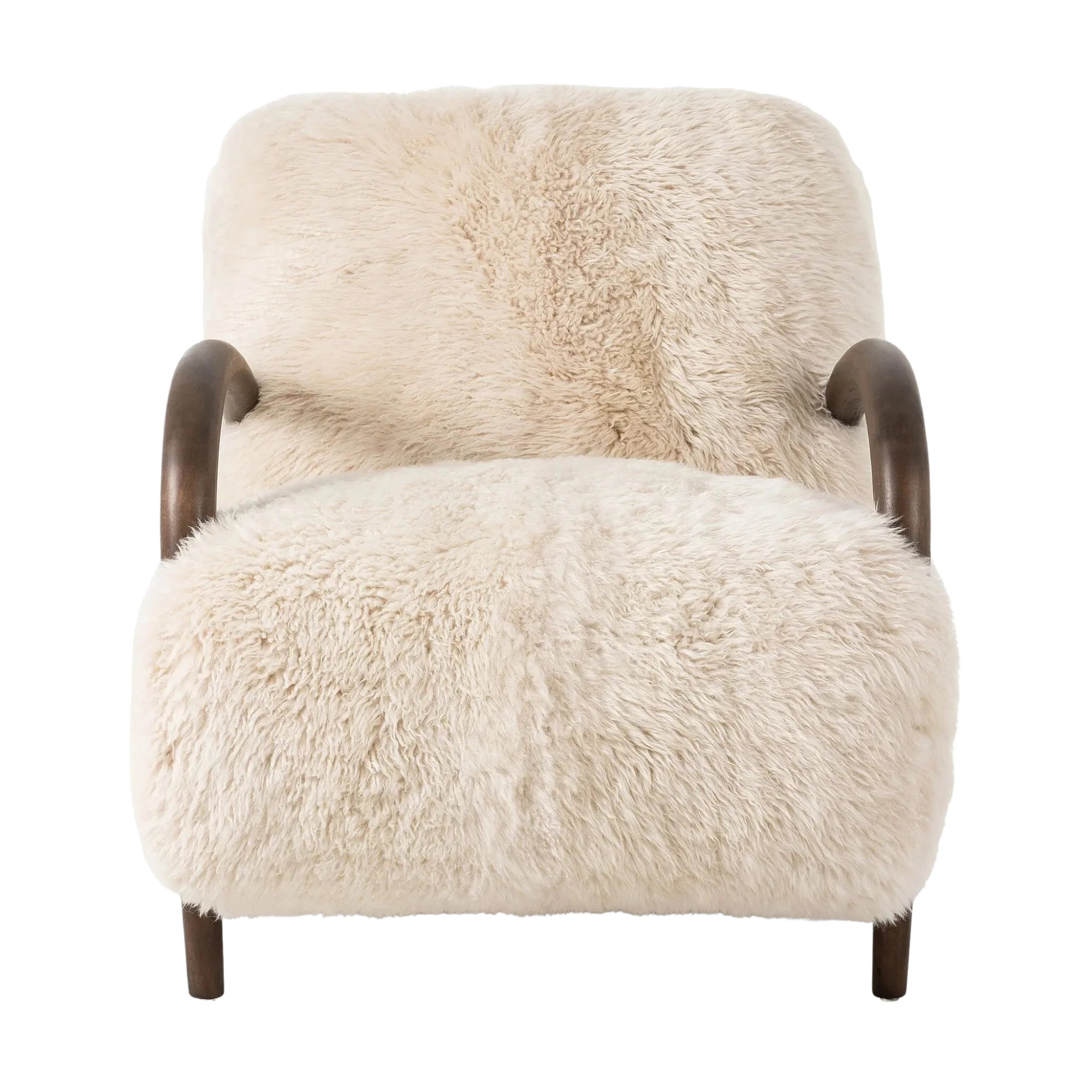 This versatile accent chair is upholstered in a faux Mongolian shearling with a textural high pile. A contrasting, chunky parawood frame hugs the seat and is wire-brushed for a warm, vintage feel.