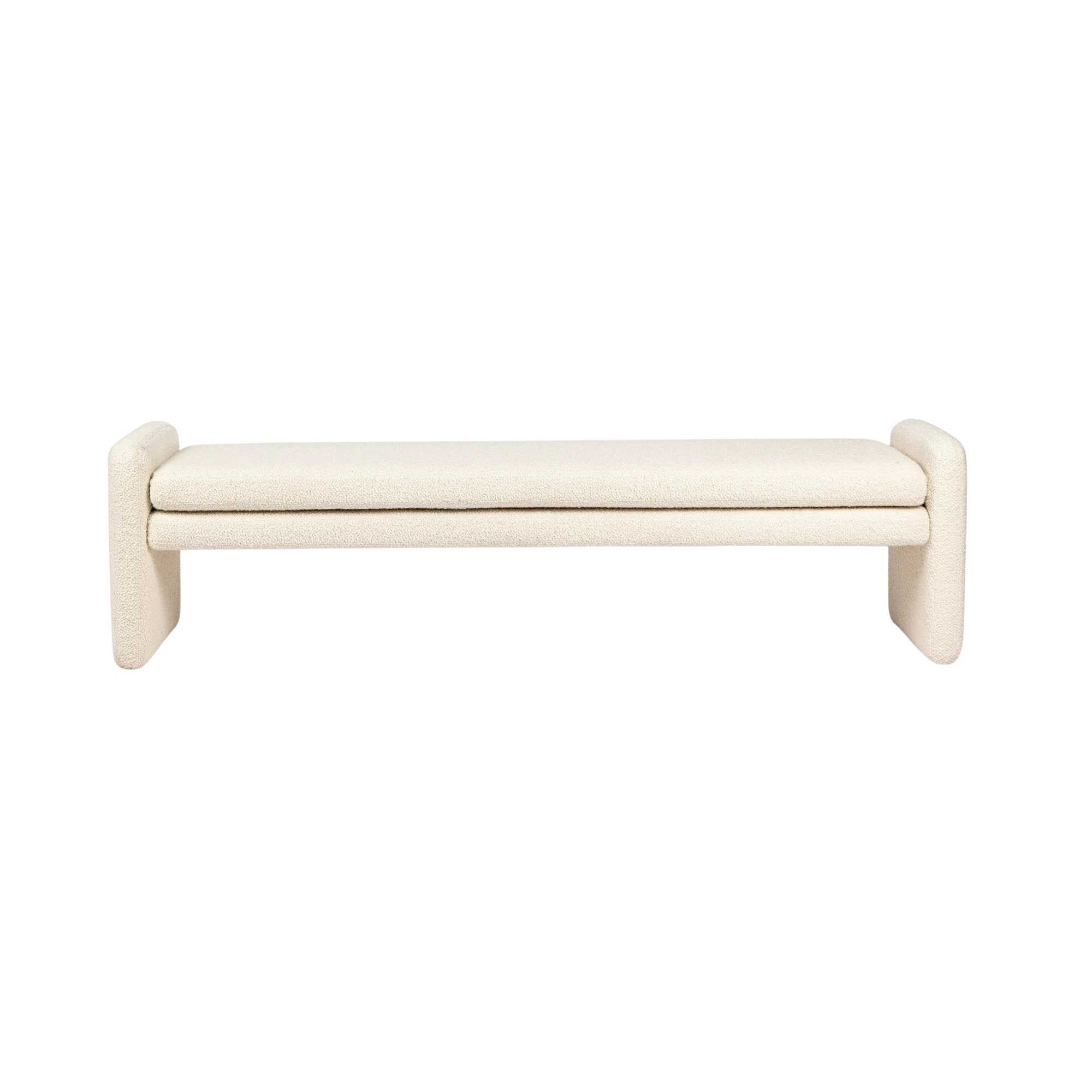 Cream, boucle-like upholstery covers a long, sophisticated dining bench.