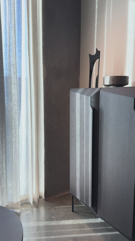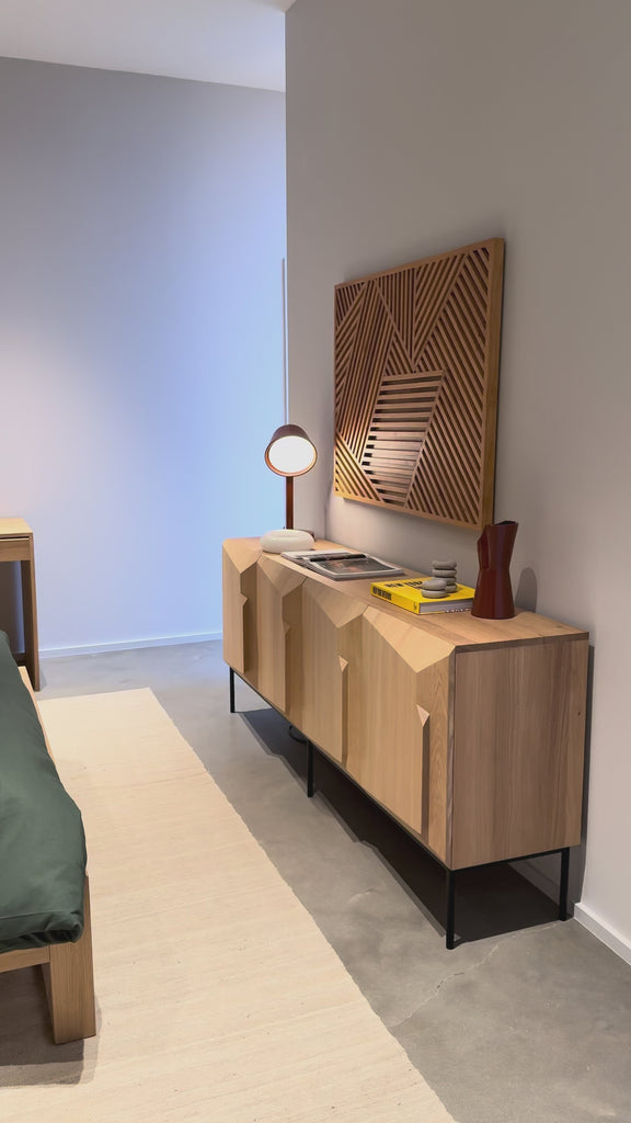 An angular composition, designed by Alain van Havre, forms the heart of a design that aims to distance itself from traditional static and immobile surfaces. A unique sense of volume is created which alters your perception of the sideboard as you walk by.
